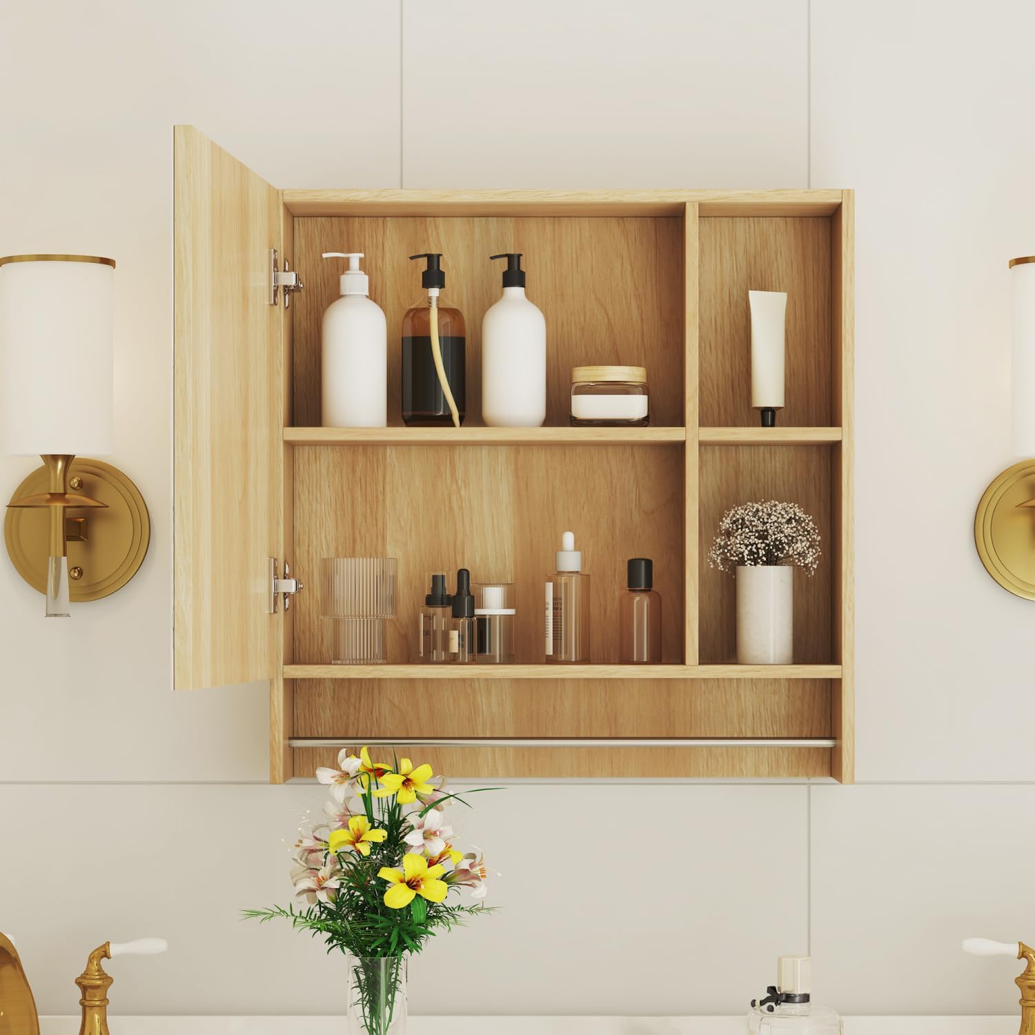 Material: MDFColor: Burly WoodMoisture-Resistant: YesStorage Compartments: 4 (2 Open + 2 Hidden)Towel Rack: IntegratedMounting Type: Wall-MountedPackage Includes: Mirror Cabinet, Hardware, Assembly GuideCountry of Origin: ChinaNotes: Colors may vary slightly due to screen calibrationOptimize bathroom space with this space-saving 2-in-1 mirror cabinet that combines a high-definition mirror with hidden and open storage compartments. The 4 storage areas (2 open + 2 hidden) and integrated towel rack keep essentials organized while the moisture-resistant finish ensures durability in humid environments. Quiet metal hinges provide smooth, noise-free operation, and the distortion-free mirror delivers precise reflections for grooming tasks. Easy assembly with detailed instructions makes installation straightforward, while the modern burly wood finish adds a warm, stylish touch to any bathroom, kitchen, or entryway.