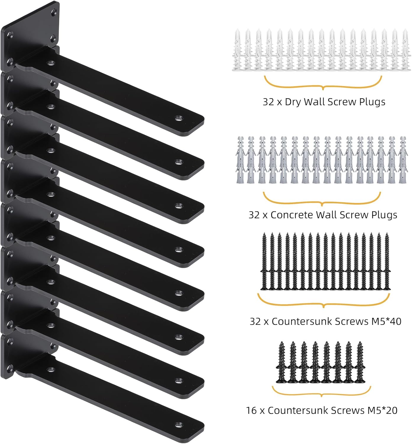 | Included Components | 16*0.787" M5 screws, 32*1.57" M5 screws, 32*1.57" Nylon expansion tubes, 32*1.65" Nylon expansion screws, 8*L-shape bracket |