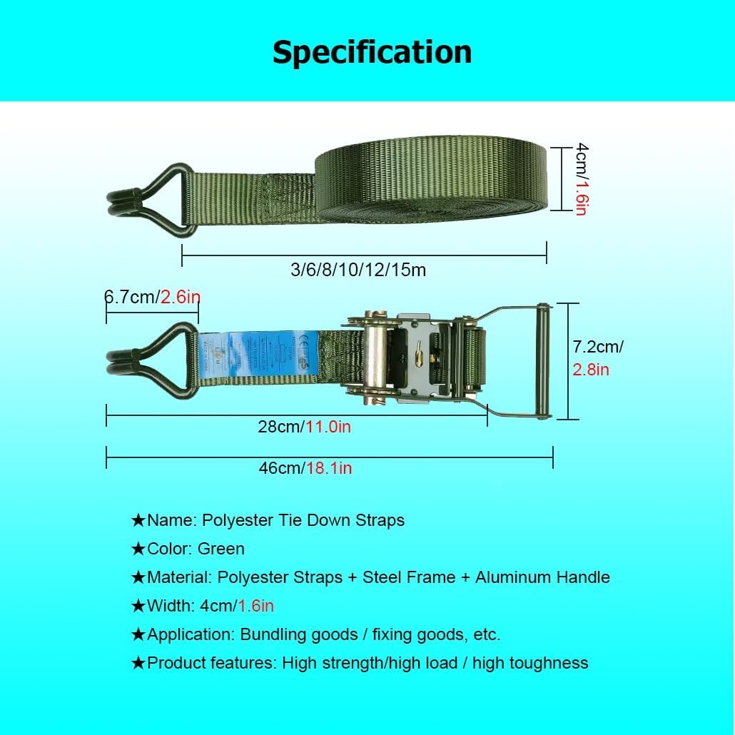 Are you still worried about cargo falling off easily?Heavy duty ratchet straps with steel hooks, tie down straps can be widely used to secure cargo for moving and securing equipment, motorcycles, trucks, vans, kayaks, warehouses, etc.Specifications: Name: Polyester Tie Down StrapsColor: GreenMaterial: Polyester Straps + Steel Frame + Aluminum HandleWidth: 4 cm/ 1.6in, 5 cm / 2 inLength: 3.0 m / 9.8 Ft , 6.0 m / 19.7 Ft , 8.0 m / 26.2 Ft , 10.0 m / 32.8 Ft , 12.0 m / 39.4 Ft , 15.0 m / 49.2 FtApplication: Bundling goods /fixing goods, etc.Features:1. High-density cargo straps are wear-resistant and break-resistant2. Cargo straps are easy to use, not easy to fall off and can be fixed immediately3. Truck straps have an easy-release mechanism to easily release the tension on the straps4. Ratchet straps have double-stitched edges to prevent slipping during use; ensure that the cargo is firmly fixed in place, giving you peace of mind when transporting cargo; reinforced stitching adds extra strength and stability to the straps5. Lashing strap are equipped with double J-hooks for easy fixation6. Tow strap have strong pulling force, 6 tons/13227 lbs7. Tie down straps are widely used, including moving, securing cargo, camping or other tie-down needs, such as warehouses, motorcycles, canoes, kayaks, ATVs, trucks, boxes, furniture, lawn equipment, etcPackage Included:1 x Heavy Duty Ratchet Strap with HookTighten Ratchet Straps Steps:1. Pass the strap under the tensioner rotating shaft2. Pass the strap through the center slot of the tensioner rotating shaft3. Pull the tensioner handle back and forthRelease Ratchet Straps Steps:1. Fasten the safety plate outwards2. Open the tensioner to level3. Pull out the strapNotes:1. Due to manual measurement, there may be a 1-2 cm error, please understand2. Due to diffe