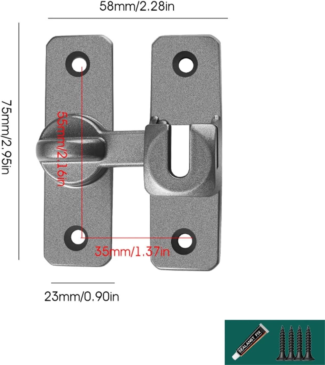 ※Smooth and Reliable Operation: Provides consistent locking and unlocking performance with a dependable mechanism for daily repeated useFeatures:Secure & Versatile The Gate Latches Slide Latch and Safety Door Lock Catch provide reliable security for doors and cabinets ensuring child and pet safety while being easy to install without punching holesHeavyDuty Construction Made from durable materials the Barn Door Lock Door Chain Lock and No Punching Durable Barn Door Hardware Latch withstand daily wear offering long-lasting performance for household and commercial use.Multi-Purpose Use: Ideal for closet doors, cabinets, and fitting rooms, the Door Gate Catch Hardware Door Lock ensures smooth operation and secure closure, enhancing privacy and organization in any space.Easy Installation: Designed for convenience, the Door Locks Latch Hasp Security Door Locks require no drilling or complex tools, making them perfect for quick upgrades on windows,and storage areas.Enhanced Safety: The Safety Door Lock Catch and Door Chain Lock provide added protection against accidental openings, suitable for households, barns, and cabinets to keep spaces secure and child-friendly.Specifications:Material: Aluminium AlloySize: 58*75mmNote:Due to the screen lighting effect, the actual color of the product may be slightly different.Due to manual measurement, please allow size error.