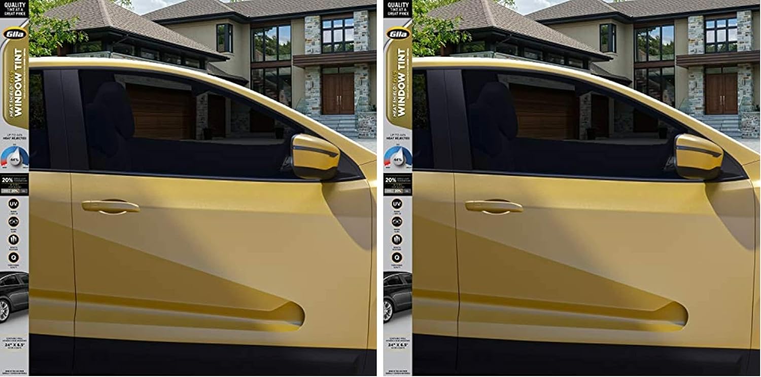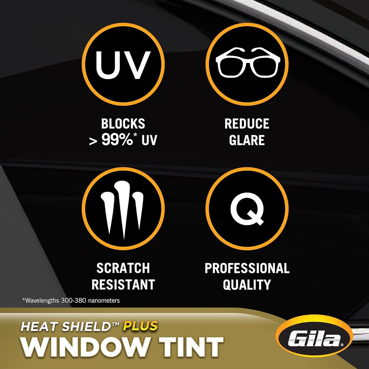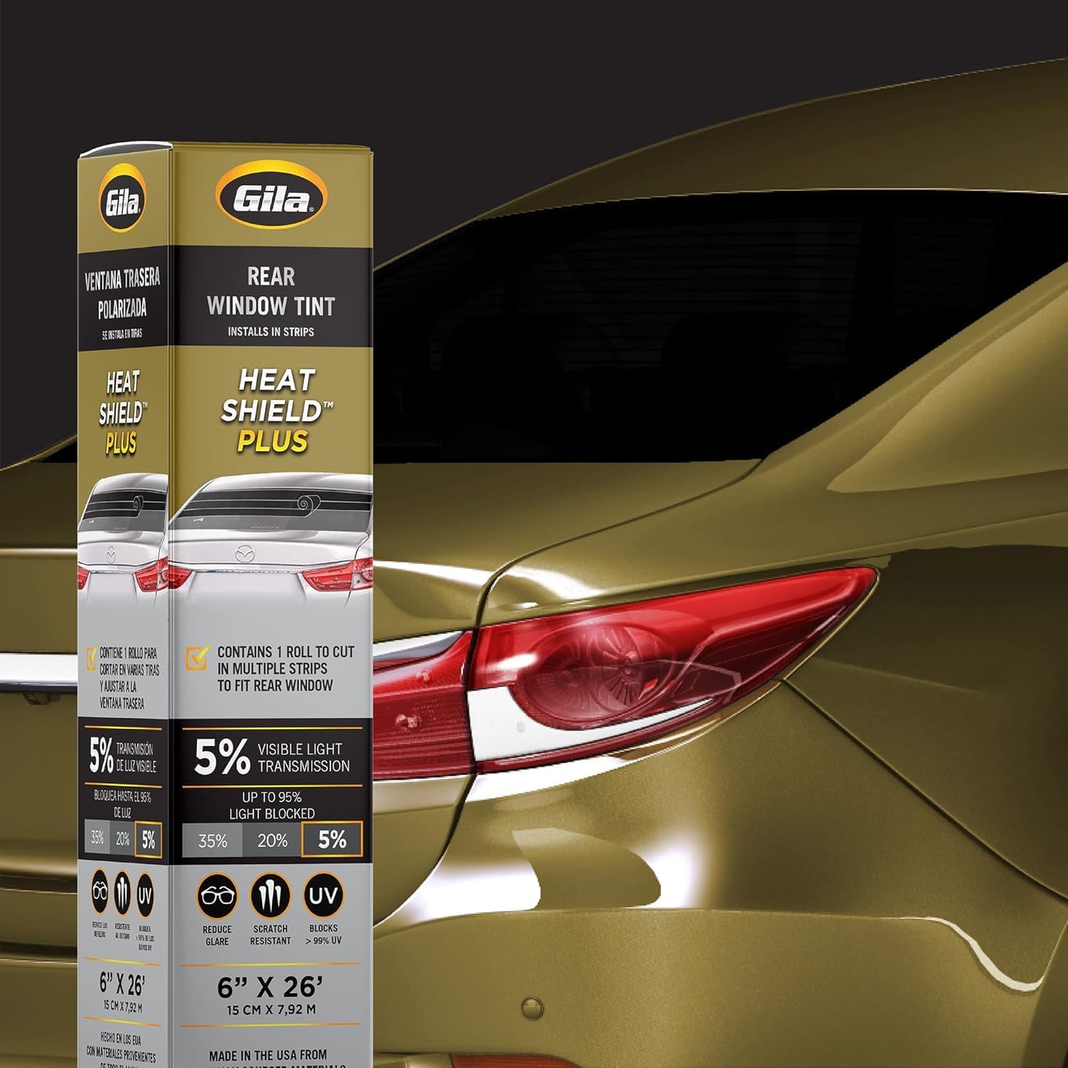 Keep your car cooler and reduce glare with this 2-pack of Gila Heat Shield Plus 5% VLT window tint. Each 24 sq ft roll blocks 95% of light to darken your windows while protecting your interior from UV rays. The durable scratch-resistant material uses deep-dye technology for a long-lasting finish. Easy to install with the included adhesive kit - no professional tinting required. This heat and glare blocking window film helps make driving safer and more comfortable by keeping interiors cooler. It blocks up to 99% of UV rays to prevent fading. The 5% VLT tint provides advanced heat and glare protection without significantly reducing visibility. The solid black color blends well with most vehicle exteriors. This window tinting film is made specifically for car windows. It is reusable for multiple vehicles. Each 24 sq ft roll covers about 10 windows. The scratch-resistant material lasts through many window tinting applications. It uses a deep-dye technology for a long-lasting, glossy finish that resists scratches and streaks.