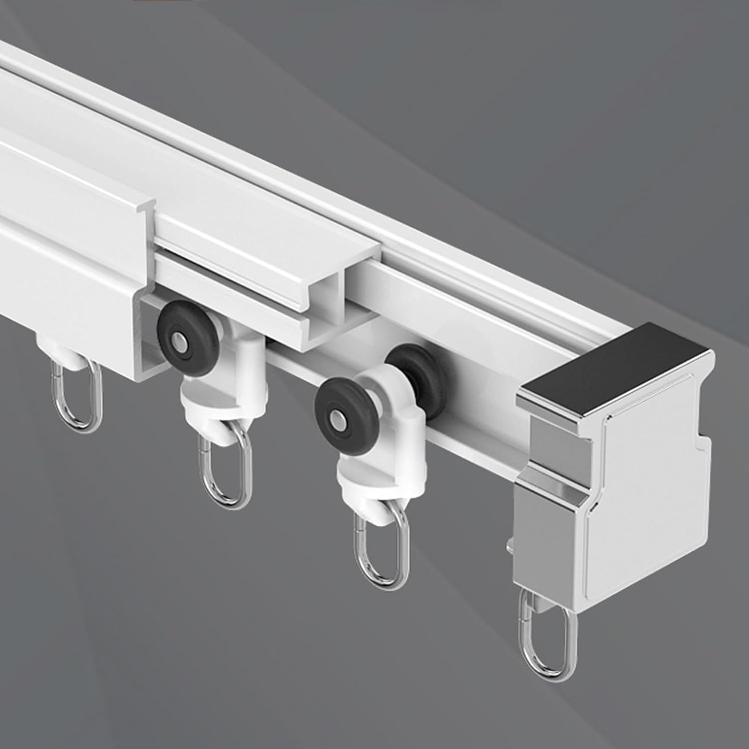 Nylon PulleyHigh wear-resistant modified nylonStainless steel hanging ringsLeft and right split designAdaptable, can be bent at any curvatureElectroplated alloy sealAluminium trackProduct Name: Split bendable trackProduct material: aluminium alloyInstallation method: top mountedQuick bending method1.Confirm the position of bending2. Press the knee against the bending place.3. Pull it to the appropriate arc.4. Bend the shape can be installed.Product list: curtain track x1Note tips:1. The product size is measured manually, there are 1-3centimetre error.2. Due to different light and shooting angles, the colour of the received product may be slightly different.