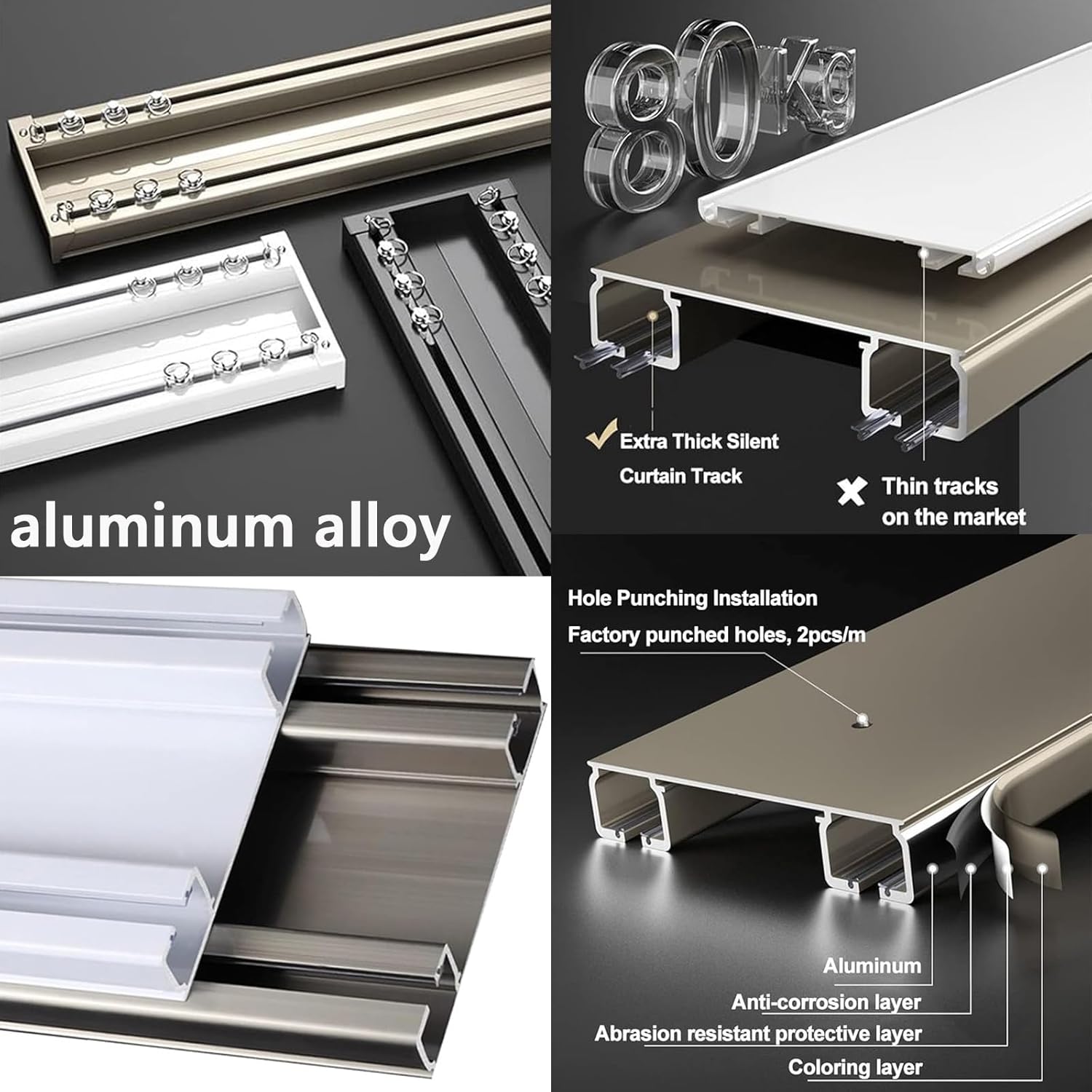 The curtain guide rails are made of high-quality aluminum alloy, which is strong, wear-resistant and durable. It has a double-layer integrated structure and has a higher load-bearing capacity than the traditional double-rail system.Name: Aluminum alloy double row curtain trackMaterial: aluminum alloyColor: black, white, champagneFeatures: Thickened rail wall, strong load-bearing capacity, silent rail and no noiseInstallation method: ceiling drilling installationAccessories: 1 pack of screws, 2 seals/set, 16 pulleys/meterWarm reminder: The product was cut off during transportation (including connectors)