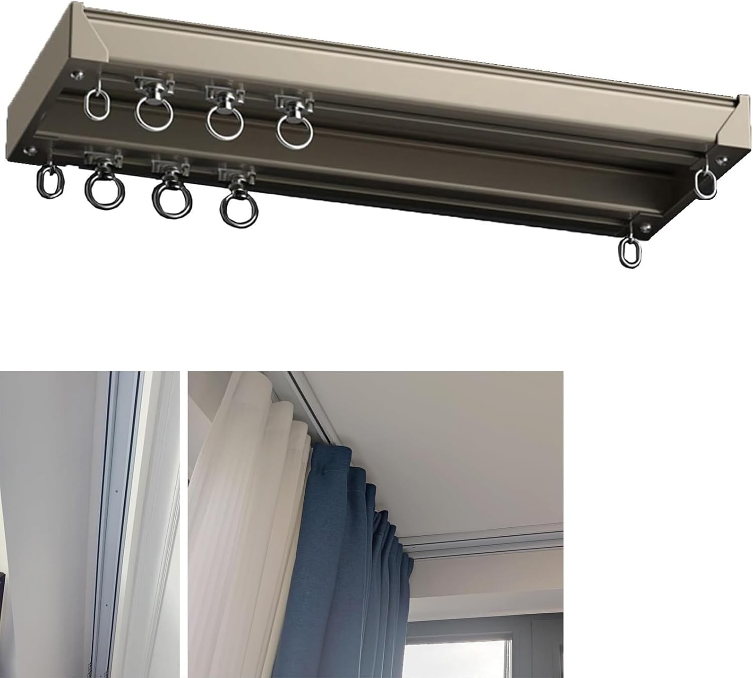 The double-row curtain track is made of high-quality aluminum alloy material with high strength. The surface is colored by high-temperature electrophoresis process. It is not easy to oxidize and fade. It can withstand heavy curtains and is both fashionable and beautiful.Name: Aluminum alloy double row curtain trackMaterial: aluminum alloyColor: black, white, champagneFeatures: Thickened rail wall, strong load-bearing capacity, silent rail and no noiseInstallation method: ceiling drilling installationAccessories: 1 pack of screws, 2 seals/set, 16 pulleys/meterWarm reminder: The product was cut off during transportation (including connectors)