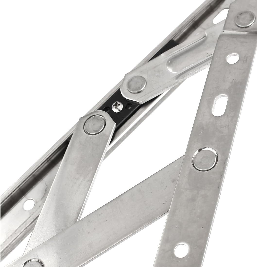 Aexit 202 Stainless Steel 12-inch Window Casement Hinges Stay Silver Tone 2pcs (d31457640e3f8cc08aa9945cc0b896d0)This casement window hinge is constructed from 202 stainless steel.It features a non-handed 4 bar hinge with stop and adjustable pad. This type of casement window hinge should be installed on the upper and lower sides of the window.Be sure to check your home window suitable for this casement hinges or not before buying.Description in French202 charnières à pour fenêtre à battants de 12 po en acier inoxydable, couleur argentée, ton argenté, 2 piècesNom du produit: charnière à pour fenêtre; contenu de l'emballage: charnière à pour fenêtre 2pcs xCouleur principale: Ton argent; Matériel: Acier inoxydable 202Poids: 540g; Dimension: (plié) 303 x 22 x 15 mm / 12' '0.87' 'x 0.6' '(L * W * H)Diamètre du trou de montage: 5mm / 0.2' '(D), 10 x 5mm / 0.4' '0.2' '(L * W); Épaisseur du bras porteur: 2.5mm / 0.1' 'Quantité de barres: 4; Largeur de fente: 22mm / 0.87' '