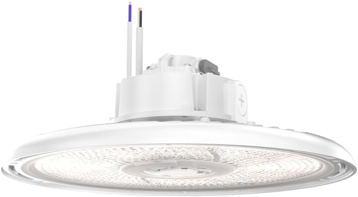 The Lithonia Lighting REBL Round High Bay LED Light is designed for versatile and efficient illumination in industrial and commercial spaces. With 24,000/27,000/30,000 adjustable lumen output and switchable white color temperatures (3500K/4000K/5000K), this high bay light offers 9 potential configurations within a single fixture, making it perfect for various lighting needs. Equipped with high-efficiency LEDs that provide up to 187 LPW, this LED shop light is ideal for work environments. The 0-10V dimming driver allows you to adjust brightness levels down to 10% for precise control of your lighting needs. The micro-prism optics deliver uniform and comfortable illumination, ensuring that every corner of your space is brightly lit without glare. Built to last, this fixture is UL/C-UL listed, Wet location rated, IP66, NEMA 4X, and NSF Splash Zone 2 certified, providing the durability and safety required for harsh environments. With an impressive 100,000-hour lifespan and greater than 70% LED lumen maintenance (L70>100,000), this light is engineered for long-term performance. Installation is easy and secure with the patented flip hook and safety latch, allowing for quick mounting with a ¾" threaded pendant mount. Compact and rugged, the REBL Round High Bay LED Light measures 14.6" x 14.6" x 7.7" and is backed by a 5-year limited warranty, making it a reliable and efficient choice for lighting warehouses, factories, and large commercial spaces.