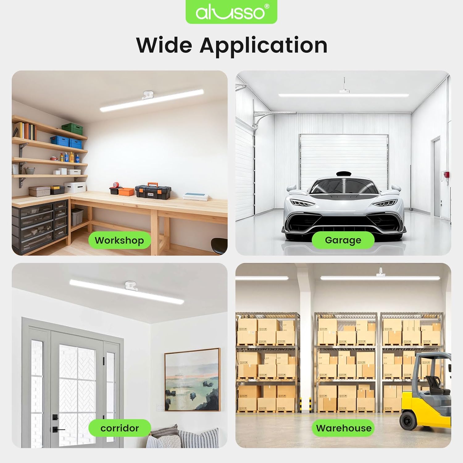 ALUSSO LED Garage Lights combine powerful performance and versatile design to meet all your indoor lighting needs. With 36W energy-saving LEDs producing 4200 lumens, this shop light delivers wide, even brightness across a 120° beam angle, eliminating dark corners. Choose from three color temperatures—3000K (cozy warm white), 4000K (clear natural white), and 6500K (vibrant cool white)—to customize the atmosphere for any activity, from detailed workshop tasks to relaxed storage organization. The light head rotates horizontally, allowing you to adjust the direction of light effortlessly. Installation is simple and tool-free thanks to the standard E26 base, fitting directly into existing sockets without additional modifications. Crafted with a clean, low-profile design, these durable lights are ideal for garages, basements, workshops, attics, utility rooms, and more. Each pack includes two reliable LED shop lights, offering great value and immediate lighting enhancement for your home or workspace.