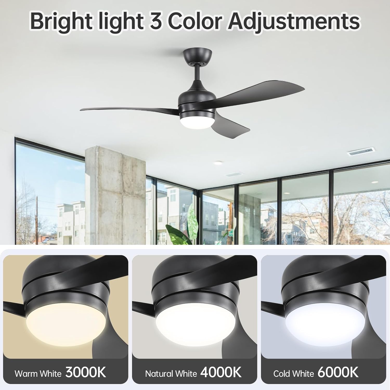 52-Inch 3 Blaed Ceiling Fan With LED Light Upgrade your comfort with our advanced ceiling fan, powered by a high-efficiency Reversible DC Motor! Designed for superior performance, this motor delivers powerful airflow while operating quietly and consuming up to 70% less energy than traditional AC motors.Smart, practical, and user-friendly—this ceiling fan combines advanced functionality with sleek design for a seamless experience. Upgrade your comfort with intelligent cooling at your fingertips.This ceiling fan not only balances design and performance, but also meets the needs of people at the same time, providing multi-functional remote control can realize the intelligent conversion of the fan. Summer&Winter Two Wind Code Enjoy year-round comfort with the reversible function—switch between downdraft mode in summer for a cooling breeze and updraft mode in winter to circulate warm air evenly.These two models meet your needs in different seasons of winter and summer, adding happiness to your home life. Exquisite product details Elevate your space with our premium ceiling fan, crafted with precision and style. Featuring three high-quality ABS blades for smooth, efficient airflow, this fan combines performance with modern aesthetics. The adjustable downrod (5/10/24 inches) ensures a perfect fit for any ceiling height. 3 Color Adjustments The built-in memory function remembers your last setting, so you don’t have to readjust every time. Energy-efficient and long-lasting, this 18W LED delivers bright, flicker-free illumination while reducing power consumption.