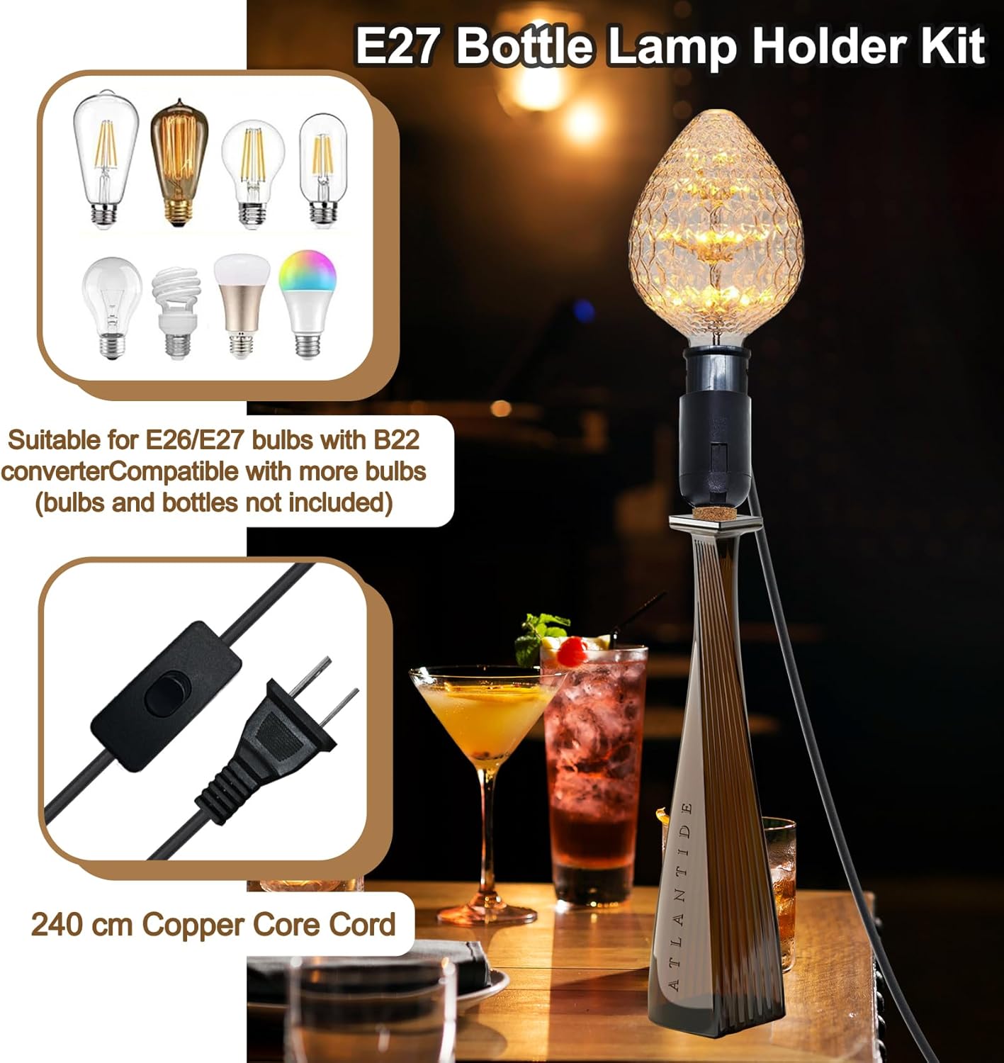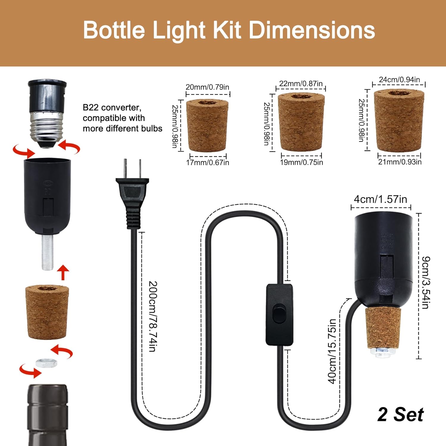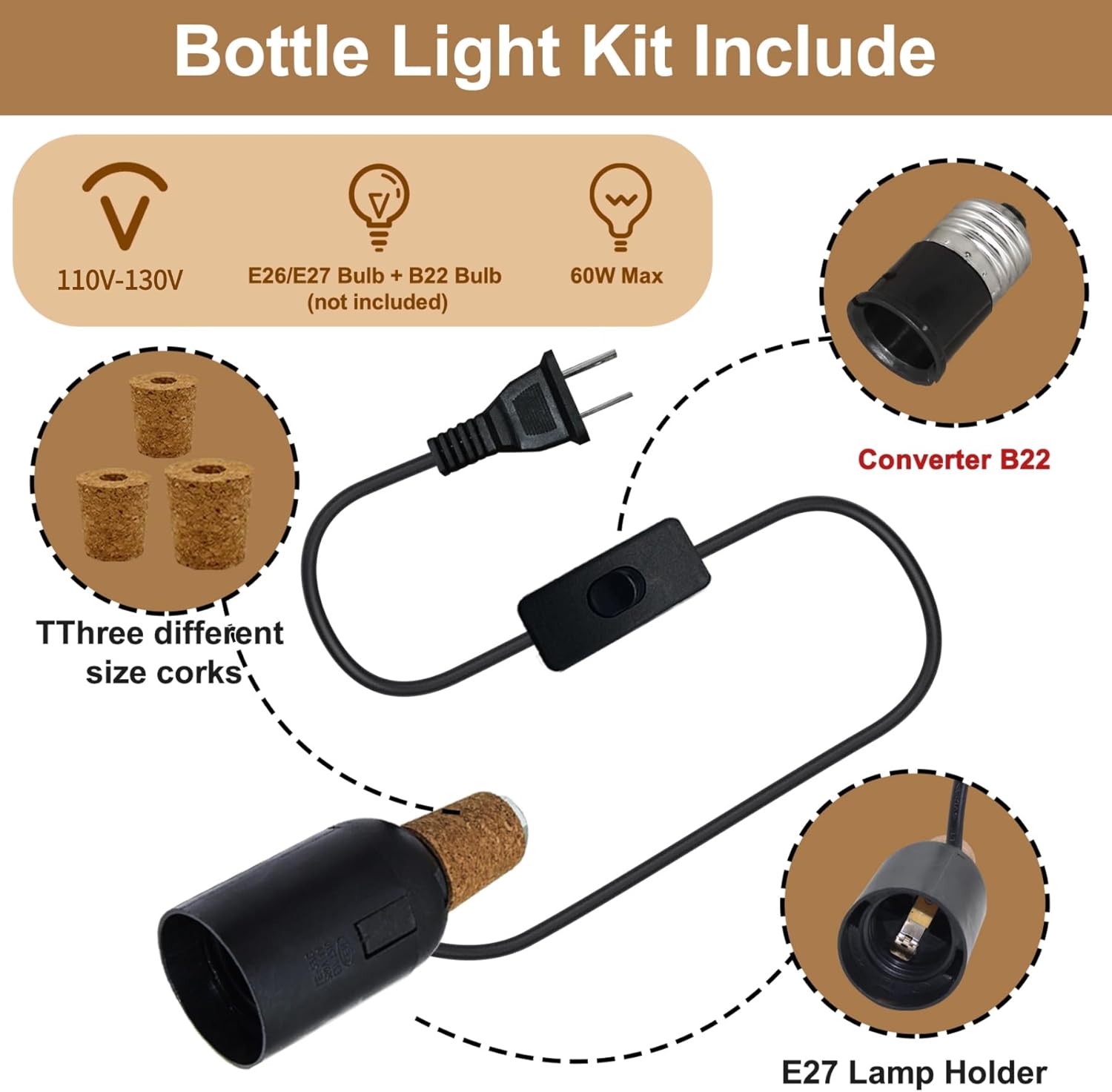 Bottle Light Kit Our bottle light making kit contains 2 pieces of light making kit 2* (3 different corks and B22 converter), compatible with most bottles on the market, the B22 converter allows you to pick more bulbs to decorate, suitable for a variety of home styles, our bottle light kits come with switches and plugs, easy and convenient to operate. Cork plug-in design, no need to drill holes, plug and play, let you enjoy the lighting experience of your own handmade unique lamps Specification: Product: 2pcs wine bottle light kit Color: white/black optional Power: 60 watts Head: E26/E27 Cable length: 240 cm Features: 1.A 3 different size stoppers (17 - 20 mm, 19 - 22 mm, 20 - 24 mm) compatible with different bottles. 2.B22 converter, so that the wine bottle table lamp can be compatible with more bulb designs 3.Simple and easy to understand installation steps, no need to drill holes, plug and play, even without extensive DIY experience, you can easily complete the installation of table lamps and bottle lights. 4. In addition to being used as daily lighting, it can also be used as home decorations, placed in the living room, bedroom, study room and other corners, adding unique charm to the space! Bottle light kit packing list 2 * bottle light kit 2 * B22 converter 6 * Bottle stoppers 1 * Instruction