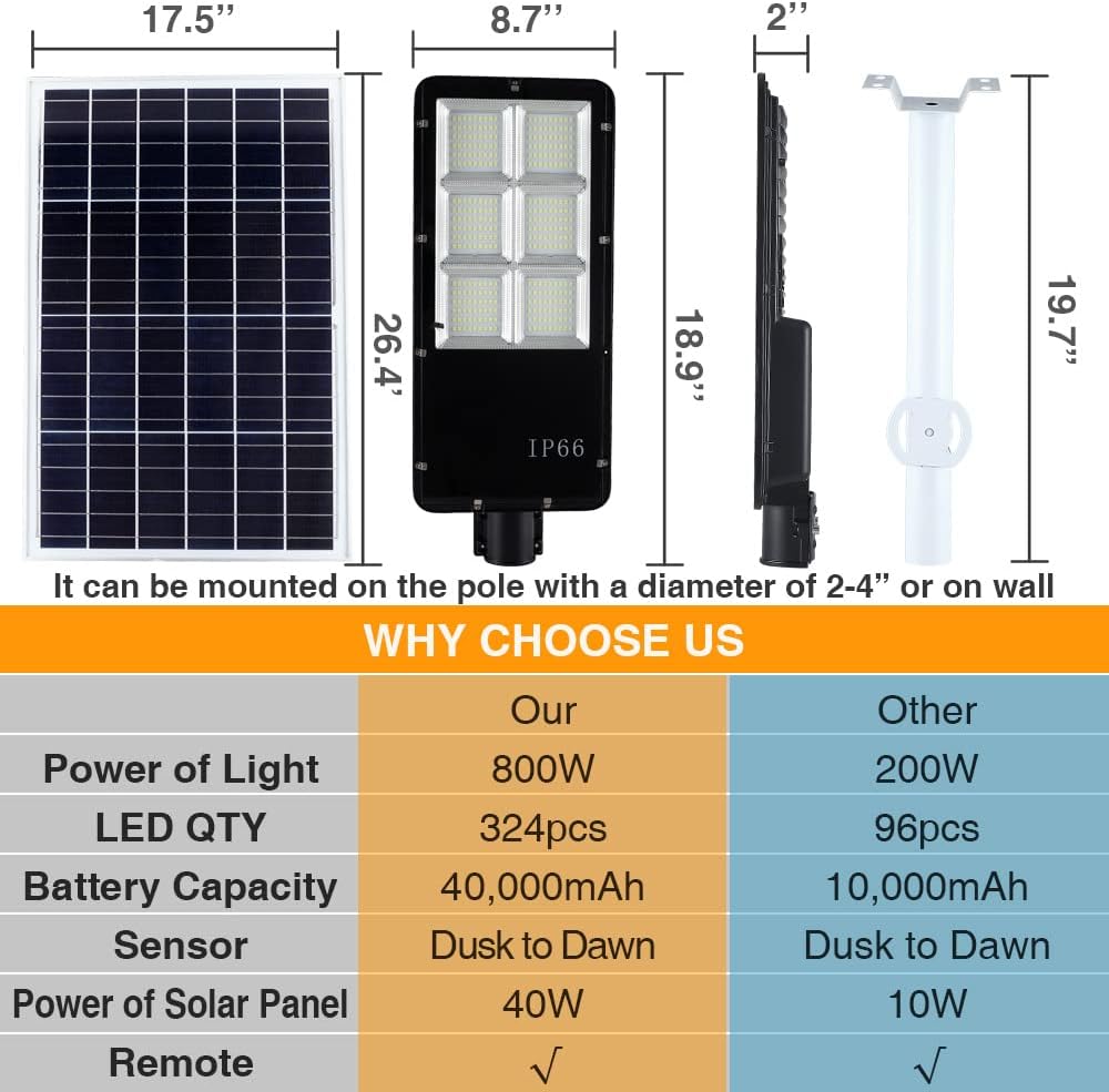 800W LED Solar Street Light with Pole and Remote ControlFeatures: - Waterproof, no pollution, dustproof and durable, high-temperature resistance and long lifespan - Light up automatically in the dark and turn off in the day time or bright light condition.- Build-in Lithium battery, no pollution, energy saving, environmental protection and long lifespan.- 9 level brightness can be set according to your need: 10%-100%- 2 ways to install, it can be mounted on the pole with a diameter of 2 to 4 inch or on wall.- If have any questions, please contact with our customer service, easy and fast replacement is offered.Specifications: - Power of Solar Street Light: 800W- Battery: 3.2V/40,000mAh- Solar Panel: 12V/40W- LED: 324pcs- Color Temperature: 7500K/Cool White- Working Time: Approx. 16 Hours after Fully Charged- Charging Time: 6 Hours (if get enough sunlight)- Waterproof Grade: IP65- Material: Aluminium Alloys/Glass- Working Temperature: -25℃-60℃- Solar Street Light Size: 18.9 x 8.7 inch- Solar Panel Size: 26.4 x 17.5 inch- Pole Length: 1.65ft/50cm- Diameter of Pole Mounting Bracket: 2-4 inchPackage Included: 1 x Solar Street Light 1 x Solar Panel 1 x Mounting Bracket1 x Assembly Accessories Set1 x Remote Control (battery included)Note: - Solar panel should be placed where can receive maximum sunlight directly. - The solar light should not be installed near strong sources of light.