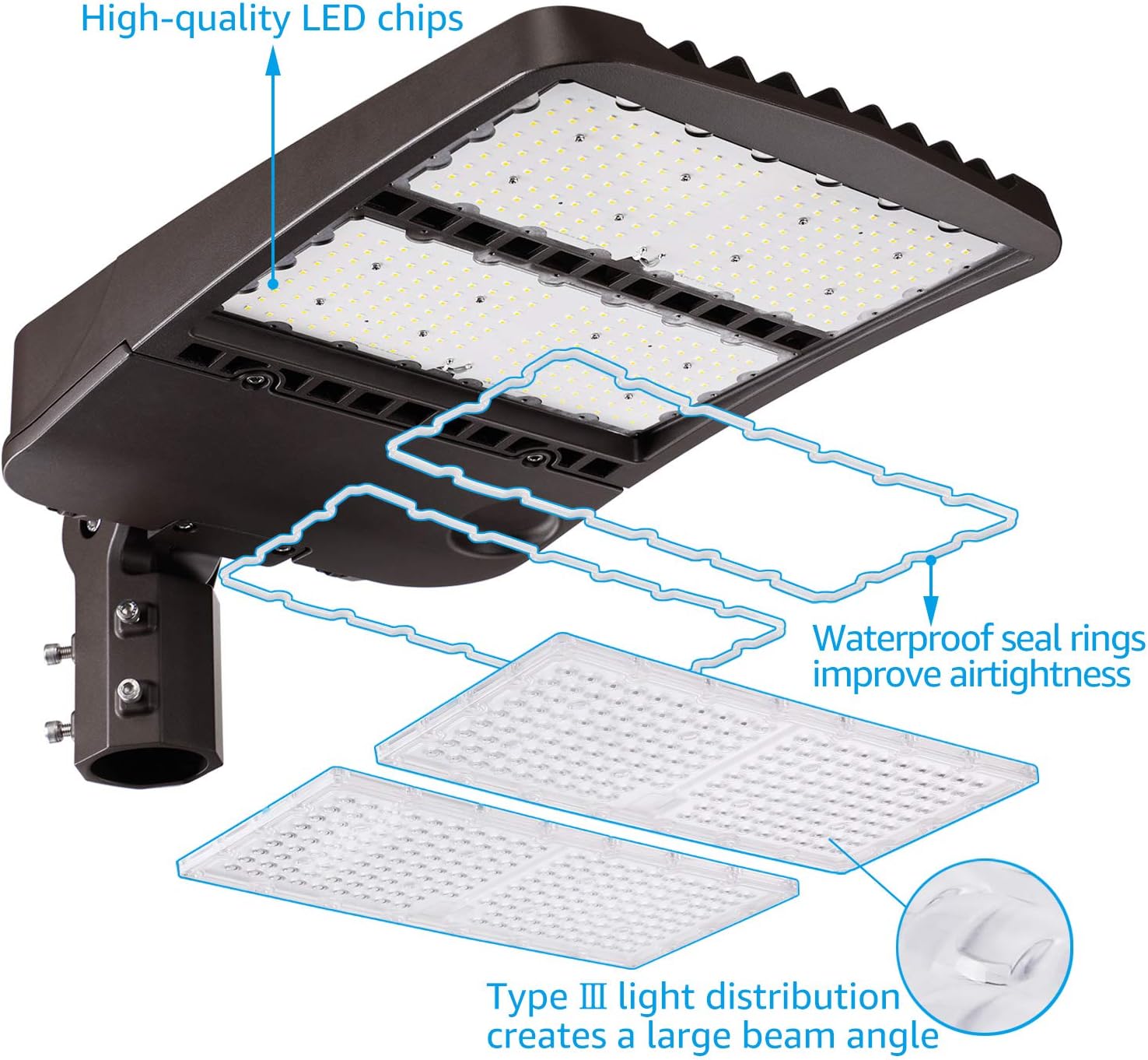 Amazing Features - The highly efficient Led chops emit 39,000lm of high-brightness, matching the output of a 3000W incandescent. - The die-casted aluminum light body has excellent heat dissipation, extending the lifespan to 50,000hrs. The uniquely designed pressure relief cap balances the pressure inside and outside the lens, protecting it from deformation. - This light comes with a sensitive photocell and a shorting cap, letting you switch between dusk-to-dawn and manual wall switch control. - The simple and elegant appearance makes it great for parking lots, stadiums, streets, expressways, farms, courtyards, and other general large-area lighting applications. - This light can be mounted to a standard round pole, and it also features 180° rotation thanks to the adjustable slip fitter bracket. - This light is UL listed for its high-quality and safe use. - Warranty This product comes with a 3-year warranty for your rights and benefits as a customer, satisfaction guaranteed.Specifications Wattage: 300W Voltage: 100-277V AC Equivalent: 3000W Luminous flux: 39,000lm Lifespan: 50,000hrs Beam angle: Type Ⅲ CCT: 5000K daylight Dimming type: 1-10V Dimming range: 10%-100% Working temp: -68℉-122℉ Waterproof rating: IP65 Material: Aluminum & PC