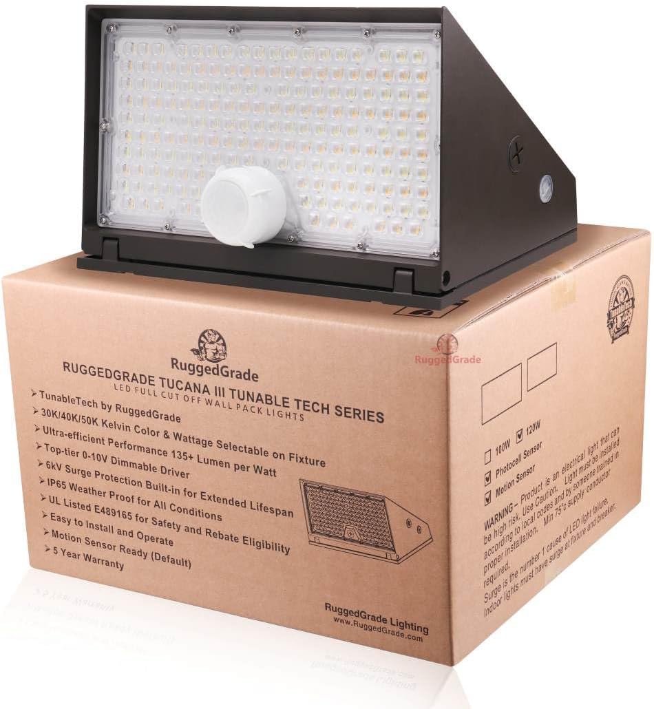 The RuggedGrade 120W Tucana III TunableTech Series LED Wall Pack Light with Photocell & Motion Sensor delivers 17,200 lumens of bright, customizable lighting with color selectable options (3000K, 4000K, 5000K) and wattage selectable (120W, 100W, 80W) directly on the fixture. Offering 140+ lumens per watt, this full cut-off wall pack light replaces 320W to 400W metal halide or HPS fixtures, providing significant energy savings and superior illumination. Equipped with an integrated photocell for dusk-to-dawn operation and a motion sensor for automatic activation, it ensures optimal energy efficiency. DLC 5.1 Premium certified, this outdoor LED light features dark brown/bronze housing for enhanced durability and aesthetics. Dark Sky compliant and featuring 0-10V dimming, this versatile wall pack is perfect for outdoor spaces, offering efficient, long-lasting, and environmentally friendly lighting