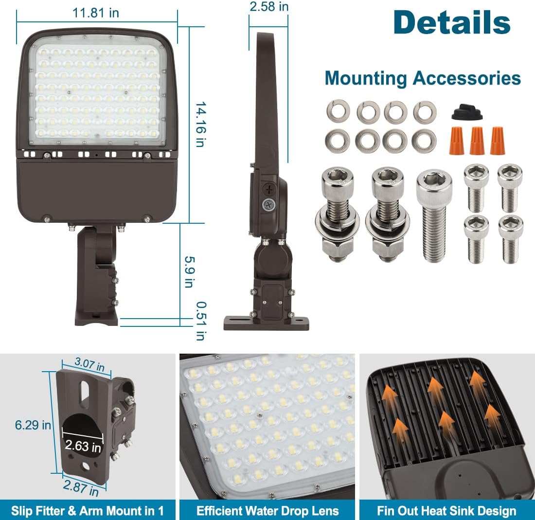 | Included Components | 1 x LED Parking Lot Light with Slip Fitter and Arm Mount in 1 Bracket, Mounting Hardware |