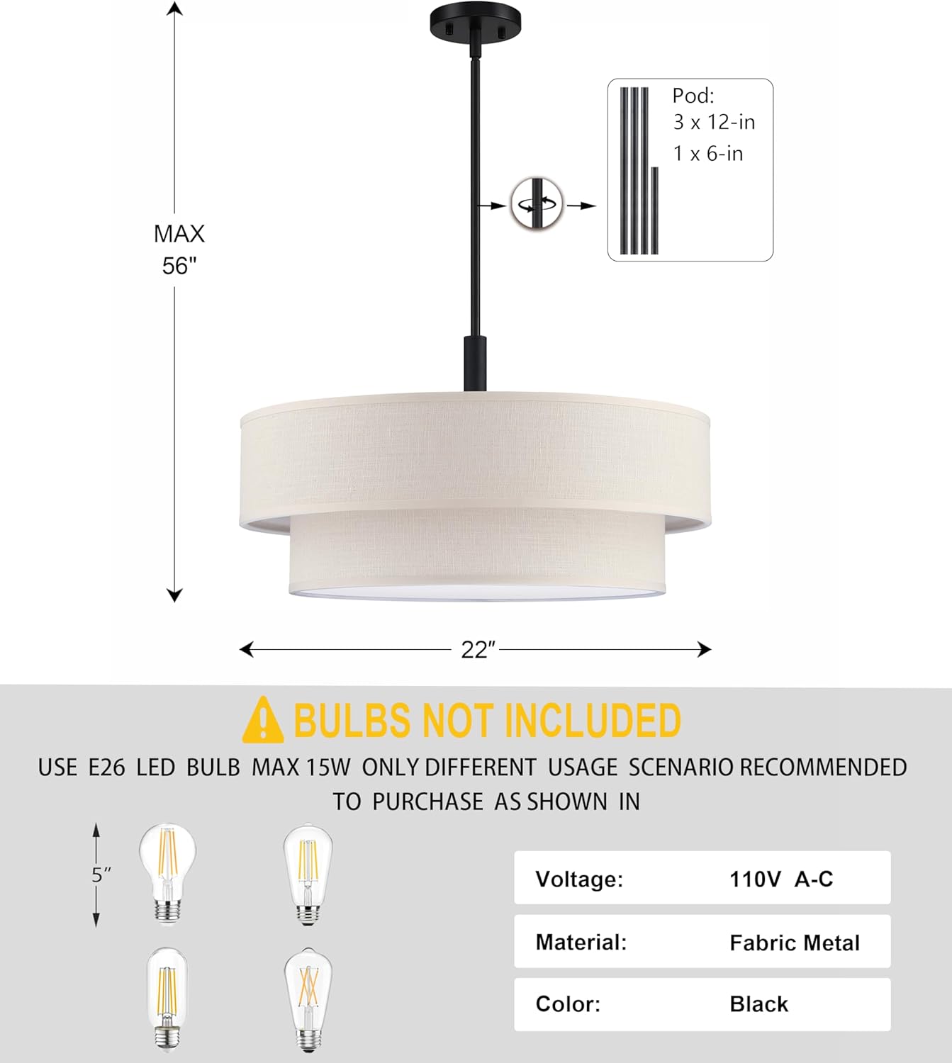 5 Light 22 Inch Cream Fabric Shade Hanging Pendant Ceiling Light Fixture,Adjustable Rod Semi Flush Mount Light Black Finish for Bedroom,Living Room,Dining Room Hallway