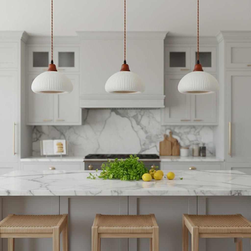 Ribbed white ceramic shades shape a calm glow. This Japanese Mushroom Chandelier set softens harsh light and adds quiet character to everyday spaces.As Minimalist Pendant Lights Kitchen Island. Adjustable cords let you set the height to match daily routines.Blending Wabi-sabi Ceramic Hanging Light Fixture style with Mid-Century Modern Pendant Lighting balance, this set refreshes your home.Product DescriptionType: White Pleated Ceramic Pendant Lights Set of 3Application: Indoor lightingPower supply type: hard-wiredStyle: Wabi-sabi, NodicMaterial: Ceramic, Wood, IronColor: WhiteSize InformationLamp body Height: 16.5cm/6.49inDiameter: 23cm/9.05inWall-mounted box Diameter: 10cm/3.93inSuspension line length: 200cm/78.74in(Adjustable)Lighting InformationLight source type: E26/E27 base bulbs (not included)Recommended Bulb Type: LED or Edison bulbsWhether it contains a light source: NoPower: Max 40 wattsVoltage: 110 to 240 voltsApplicable area: 3 to 5 square metersRoom Type: Bedroom, Kitchen Island, Dining Room, Attic, Kitchen, Bathroom, Living Room, Study Room, Hallway, Dining Room, Restaurant, Cafe, bar, porchPackage includes:1 White Pleated Ceramic Pendant Lights Set of 31 Installation packageBulb Information - IMPORTANT: E26 (mainly North American) and E27 (mainly European, Asian, etc.) connectors are physically very close in size and can usually be used interchangeably. Please Note: Dimensions are manually measured; please allow a 0.4-1.2 inches error. Colors may appear slightly different depending on your monitor and whether the light is switched ON or OFF.