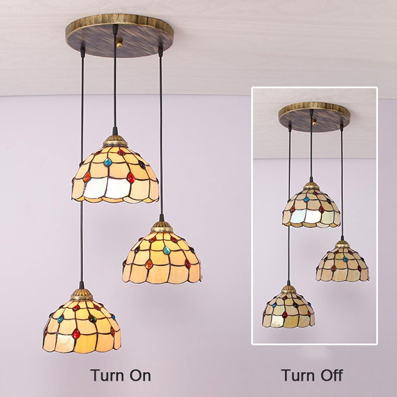 Tiffany Style 3 Light Kitchen Island Light Crystal Beads Stained Glass Chandelier American Farmhouse Hanging Lighting Fixture for Kitchen Island Restaurant Cafe Bar Specification Lampshade material: stained glass Accessories material: iron Bulb: E27×3 (bulb not included) Voltage: 110V-220V size Shade diameter - 20 cm (7.8 inches) Overall height - 120cm (47"), adjustable hanging wire Round base - 28 cm (11 inches) Rectangular base - 60 cm (23.6 inches)