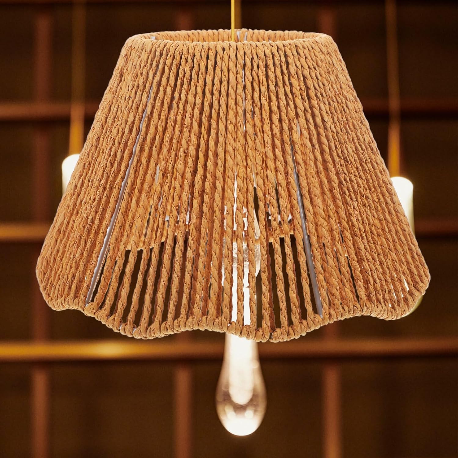 DescriptionThis lampshade is meticulously handwoven, showcasing the craftsmanship and attention to detail. Its simple-style design adds of elegance and charm to any space, making it ideal for restaurants, cafes, and other places. This woven lamp shade is very decorative and rustic.Features-Color:Brown-Material:paper string, iron-Size:22.00X15.00X11.50cm/8.65X5.89X4.52in-Note: suitable E27(diameter 4 cm) and E14 bulb(diameter 2.9 cm)- and beautiful woven design of this woven lamp shade that adds of charm to any space.- Promoting a lifestyle, this handwoven lampshade is paper rope, can longtime widely used.- This paper lamp shade can be used for chandelier or ceiling lamp decoration, good decoration effect.- This lamp shade can create a warm atmosphere for your home or other places you want to decorate, easy to use.- With the and stylish appearance, this can be not only a lamp shade, but also a delicate lampshade decor.Package Including1 x lampshade