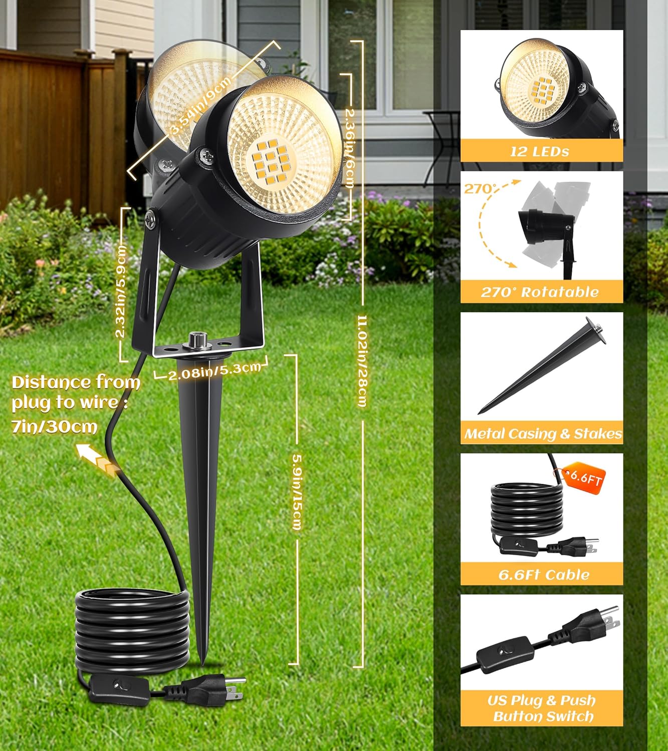 - 6.6Ft POWER CABLE & EASY INSTALLTION: Convenient use with 6.6Ft longer cable, on/off switch and US plug, our landscape spot light no need to buried wire. Quick installation, immediate results. Insert the outdoor spotlight into the ground or fix it to the wall with the included screws, then turn on the switch to start warm white lighting. This outdoor landscape light suitable for AC100-240V input. They 3000K warm white spot light are widely used in daily life or as decorations for Halloween & Chr