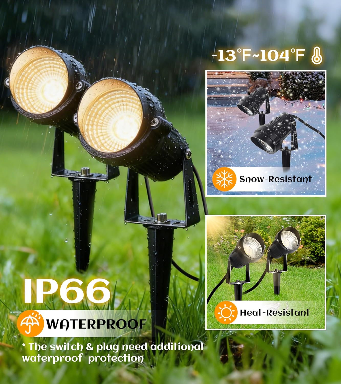 - IP66 WATERPROOF: With an IP66 waterproof rating, waterproof landscape lights can withstand rain and snow, significantly enhancing the stability and long-term usability of outdoor landscape lighting. Landscape spotlight is the best choice for use in damp environments. The aluminum surface cast texture spotlight features an excellent corrosion-resistant and heat-resistant housing, as well as a superior heat dissipation system. The switch & plug need additional waterproof protection