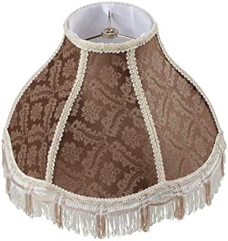 Aspen Creative offers a 1 pack handsewn scallop dome replacement lamp shade in brown. Made with jacquard textured fabric with fringe. The lamp shade size is 5 inch top, 13 inch bottom and 9-1/2 inch slant height. This lamp shade is a spider construction which is designed to attach to a lamp harp. Suitable for table lamps, accent lamps, vintage lamps, candle stick lamps, kid's room lamps, bedroom lamps, bedroom table lamps, night stand lamps, reading lamps, bedside reading lamps, living room end table lamps and bedroom night stand lamps.