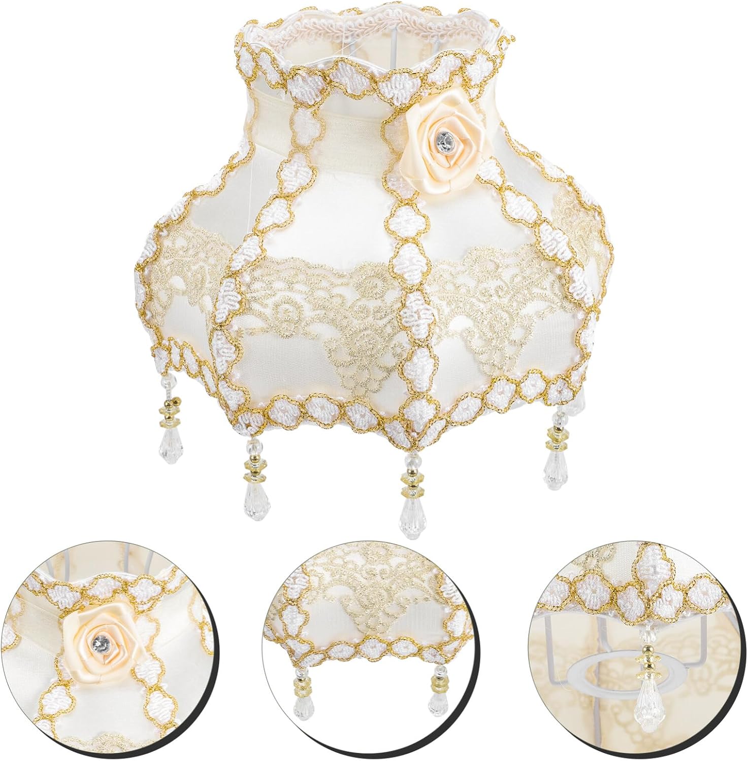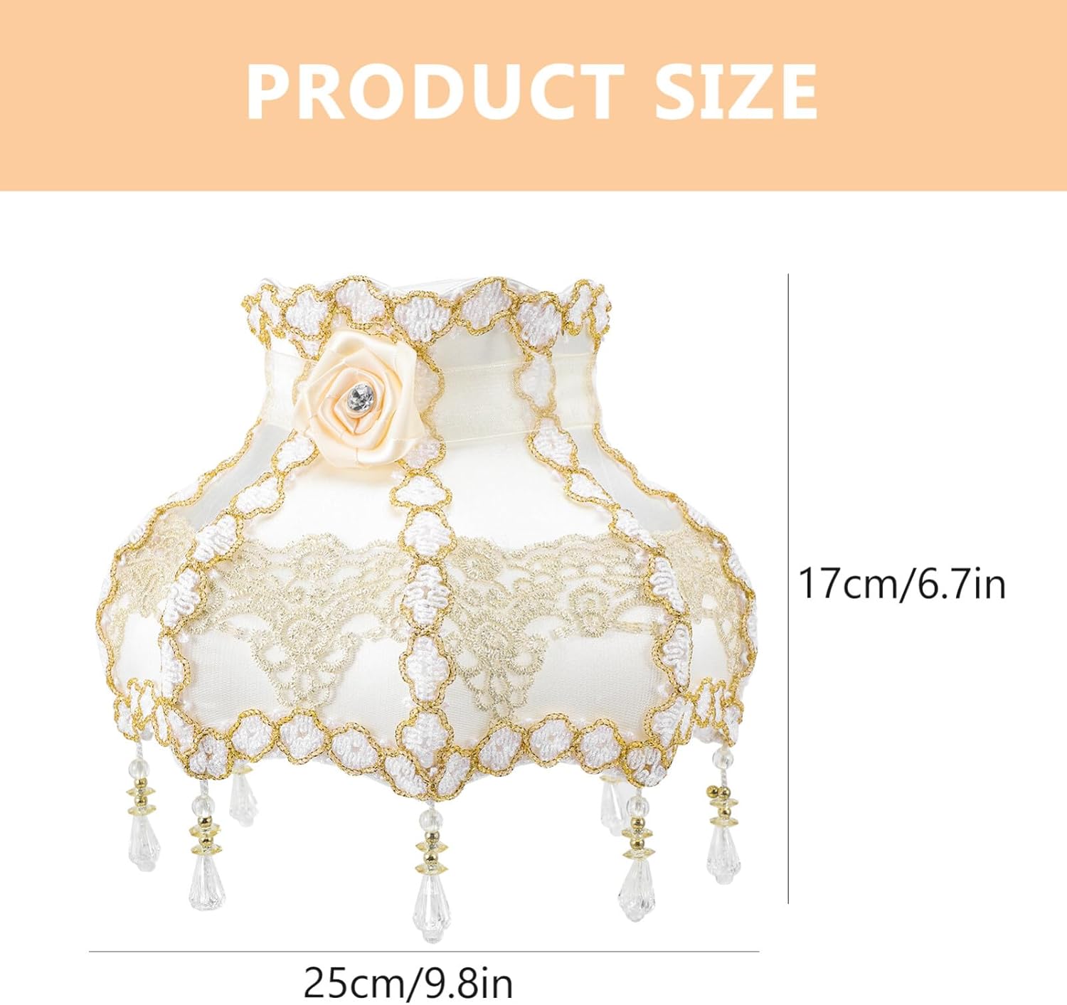 DescriptionScallop Bell Lamp Shade with Bead Tassel Vintage European Style Princess Floral Light Shade for Table Floor Lamp.Features-Color:As Shown;-Material:Cloth, Metal;-Size: 9.82X9.82X6.68in;- Note: Suitable for E27 Bulb (not Included)Package Including1 X Cloth Art Lampshade