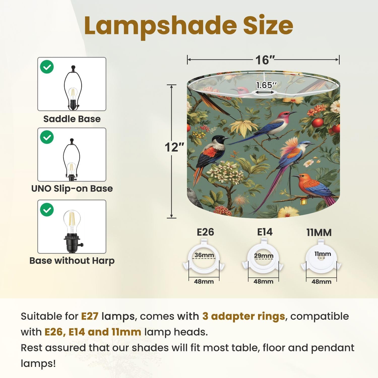 Product Specifications: Material: Linen Size: 16 "Top x 16" Bottom x 12 "Heigh, screw thread 1.65". Applies to the Type of Lamp: Table Lamp Floor Lamp Bedside Lamp Pendant Lamp Standing Lamp Warm Tips: 1. Please measure the size of the lamps and lanterns before purchasing to make sure our lampshade fits. 2. Due to different measuring tools, the size may have slight deviations. 3. You can tell us if you have any problems. If the product is damaged after receiving it, please tell us and we can resend it to you.
