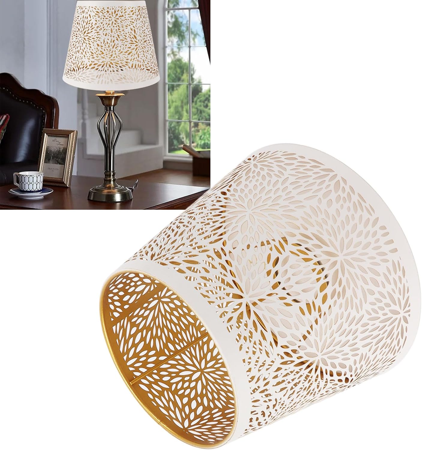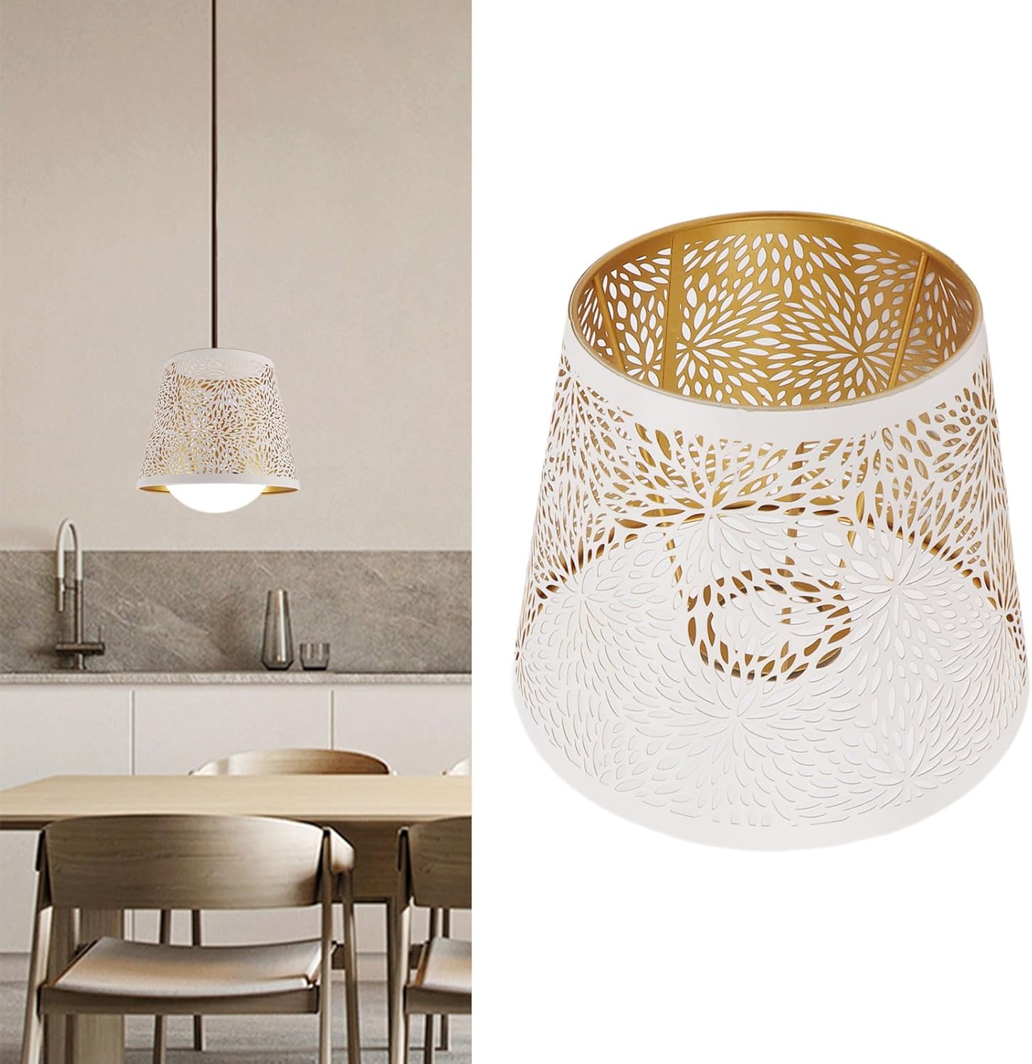 1. SHADOW LAMPSHADE: This lampshade with elements takes you back to nature, casting wonderful patterns on the wall that illuminate the entire room in the shape of the pattern when you turn on the light at night.2. RELIABLE PERFORMANCE: We use premium iron materials and exquisite patterns made by engraving process, accompanied by a layer of corrosion resistant paint coating, ensuring good heat dissipation and strong light transmission.3. EASY INSTALLATION: Simply fasten our lampshade with an E27 socket table lamp, and after it is fixed, you can insert a light bulb to emit light normally, without any complicated procedures.4. SIZE: The lampshade has a height of 15cm/5.9in, a top diameter of 13cm/5.1in, and a bottom diameter of 19cm/7.4in. You can match it with your favorite style for your room.5. MODERN STYLE: This iron lampshade design can meet most of your spaces. It can also serve as a decoration during the lighting process, creating a unique sense of fashion and modernity for your bedroom.Specification:℉Item Type: Lamp shadeMaterial: IronWeight: Approx. 311g / 11ozColor: WhiteProduct Size: 13x19x15cm / 5.1x7.5x5.9in(upper diameter x lower diameter x height)Compatible Bulb: E27, E26Installation Method: Step inHow to Use:Step in to install.packing list:1 x Lamp Shade