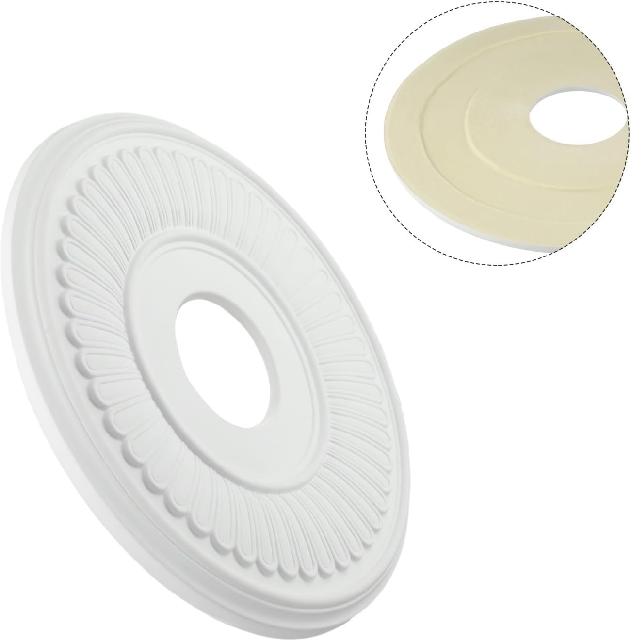 Features:*Sturdy Material:This ceiling medallion is made of PU material, which ensures its durability and longevity. It is waterproof and moisture-proof, making it resistant to aging and deformation.*Versatile Size: With an outside diameter of 33cm, inside diameter of 10cm, and thick-ness of 3cm, this medallion is suitable for most sizes of lamps. It provides a perfect fit and enhances the aesthetics of your ceiling fixtures.*Exquisite Craftsmanship: The medallion features exquisite workmanship, with a smooth item and elegant design. It adds a touch of sophistication and charm to your lamps, creating a visually appealing focal point in any room.*Easy Installation: Installing this ceiling medallion is simple and hassle-free. It comes with all the necessary accessories, and the easy-to-follow instructions make the installation process quick and convenient.*Home Decor:Whether you have ceiling lights, chandeliers, or ceiling fans, this decorative medallion is perfect to elevate and enhance your home decor. It adds a stylish and decorative touch to your light fixtures, transforming the look and feel of any room.Specifications:*Product Name:Light Fixtures Covers Plate*Material:PU*Size:About 33*10*3 cm(Outside diameter*Inside diameter*Thick-ness)*Color:WhitePackage Content:1 * Light Fixtures Covers Plate