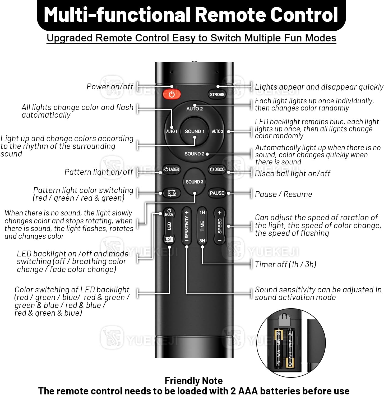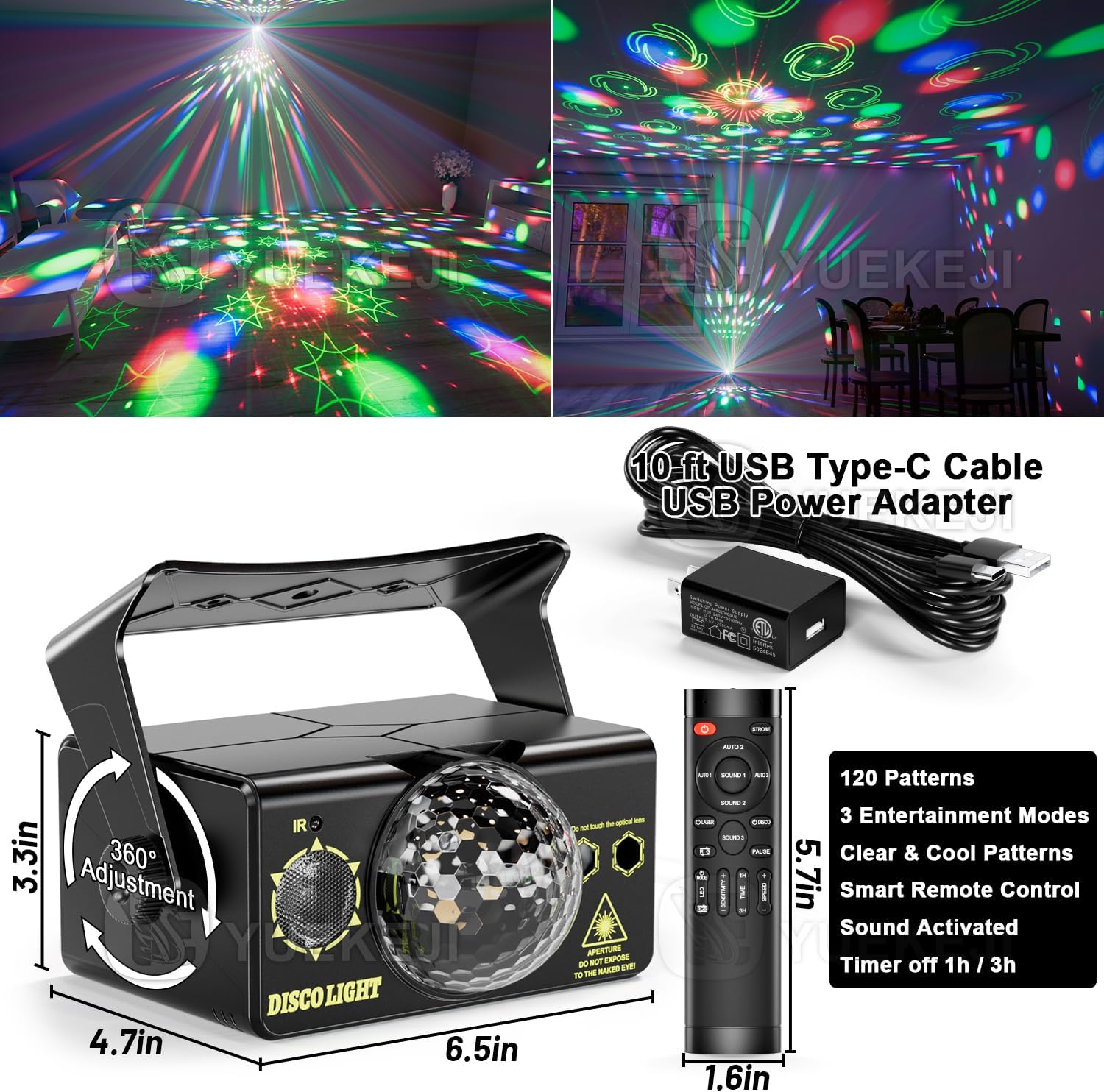Make your party more exciting! Party Lights consists of Red and Green Beam Lights plus RGB Color Disco Ball Lights plus RGB Color Par Lightsthe best coverage area of a single party light is 300 square feet, the maximum coverage can be 700 square feet, cover a larger areathe party lights have 3 voice-activated modes + 3 automatic modes + 1 pop-up flashing modes + timer modes + voice-activated sensitivity adjustments + rotary Speed Adjustment. When using voice-activated mode, the lights will flicker with the rhythm of the music, which is very nice. Suitable for any gathering, holiday, wedding, Christmas, karaoke, DJ, backyard, bedroom, living room, bar, club, birthday party, etc.What will You Get:1*Disco Ball Light1*Upgraded Control1*USB Power Adapter1*10 ft USB Cable💌How to contact us:👉Click “YUEKEJI US” under the add to cart👉Click “Ask a question”👉You can find your question, or click other to edit your questions, and then send message.