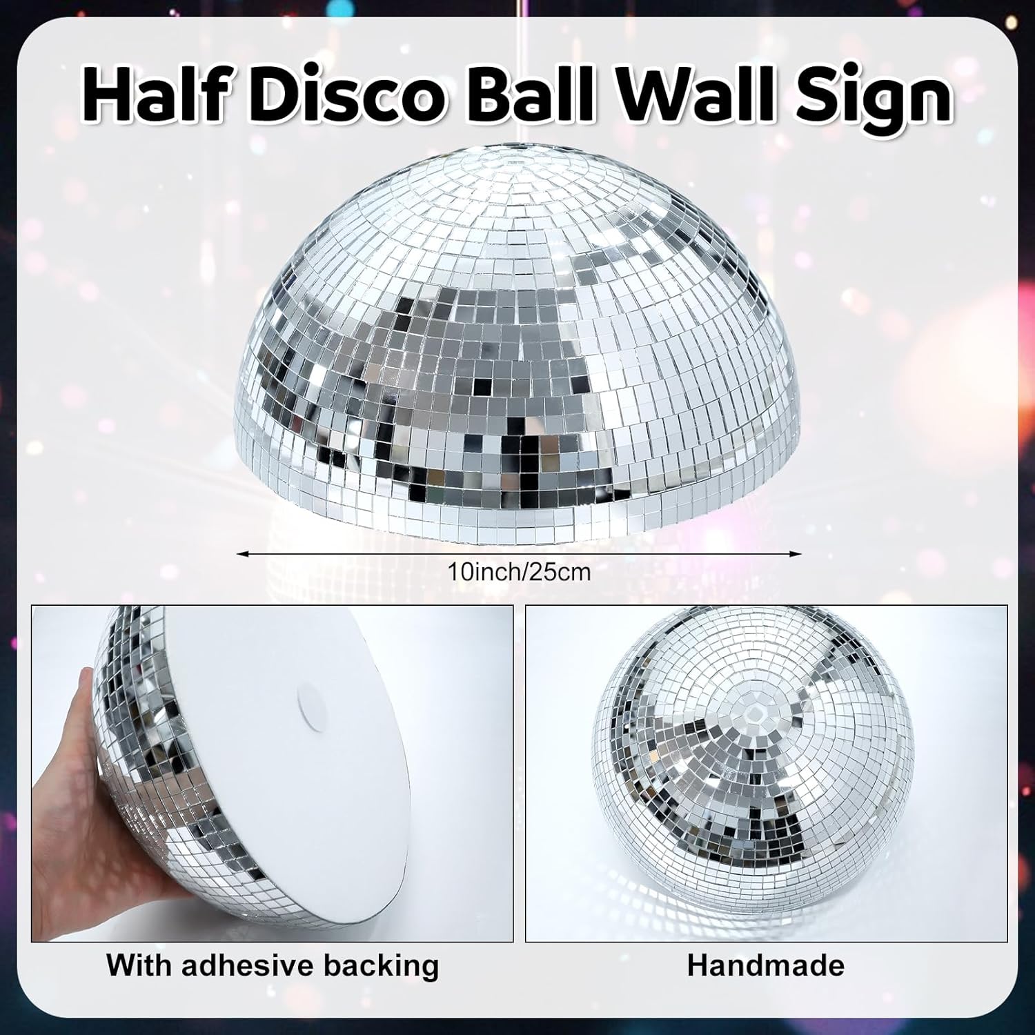 Features: Disco Party Decor: This dazzling silver hemispherical disco wall hanging, handcrafted from genuine mosaic glass, reflects light to create a stunning, shimmering effect, giving your space a fresh new look. Whether for parties, holiday celebrations, or simply to add a unique touch to your home decor, this retro-style wall hanging is suitable for capturing the nostalgic charm of the disco era Superior Materials: These disco hemispherical wall decorations are meticulously crafted from square, real glass mirror mosaic fragments set on spherical or round foam bases. Each piece is entirely handmade, making every decoration unique Specifications: Material: mosaic glass Color: silver Size: 10 inches/25 cm Package includes: 1 x Half Disco Ball Wall Sign Notes: Manual measurement, please allow slight errors on size. The color may exist a slight difference due to different screen displays