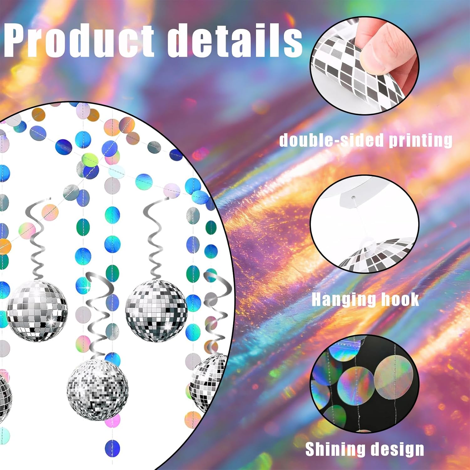 1. Product SpecificationsQuantity: 54 Pieces (6 x Disco Ball Decorations, 48 x Laser Cut Round Paper Swirls)Material: High-Quality Plastic Foil, Paper2. Product HighlightsGenerous 54-Piece Collection: Includes 6 disco balls and 48 reflective paper swirls for ample decoration.Dazzling Mirror Effect: Disco balls scatter light, creating a vibrant party atmosphere.Lightweight & Durable Materials: Easy to hang and designed for enjoyment.Ready-to-Hang Design: Simple setup with included rotating vortex pendants for dynamic visuals.Versatile Decor: Perfect for various celebrations, from disco nights to themed parties.Adds Festive Sparkle: Enhances rooms, offices, and especially ceilings.3. Usage ScenariosClassic 70s & 80s disco partiesMusic-themed events & concertsHoliday gatherings (New Year's Eve, Christmas, etc.)Birthday celebrationsDance floors and entertainment spacesOffice parties and room decorationsCreating eye-catching ceiling displays