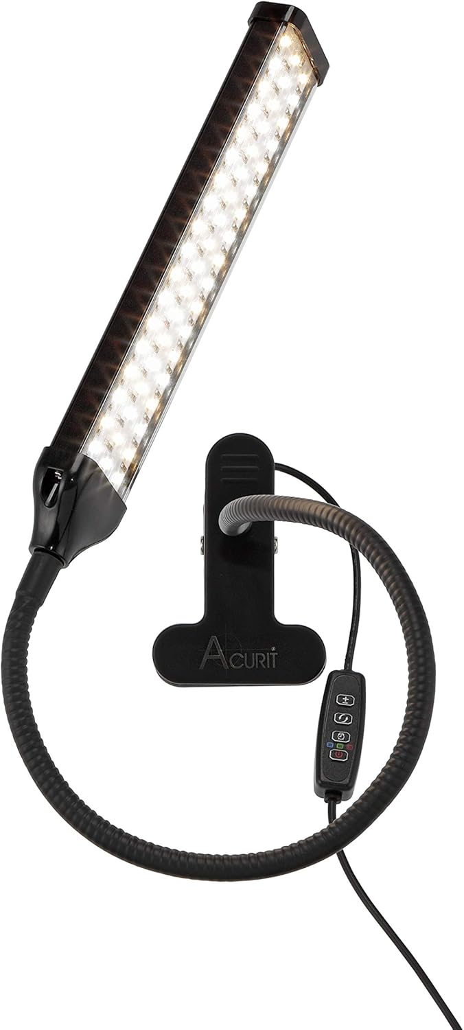 Whether you work on a table, desk, or at a Standing easel, the Acurit Clip Lamp is the perfect studio light for you. The controller Allows you to dim or brighten the LED diodes with ten brightness levels. You can also control the Color temperature from 3000K (warm white), 4000K (cool white), or 5000K (daylight). The easy to Use controller is attached to the power cord, so you don't have to worry about losing a remote! The 800 Lumens light source is equivalent to 15W LED or 60W incandescent. This lamp also Features timer settings of 3, 6, or 12 hours to make sure it turns off even if you forget. Best of All, it will retain your last settings the next time you turn it on. The entire lamp (including power cord) weighs only 0.98 lbs and comes in a compact 15.75" x 5.5" x 3.15" box, Allowing you to store it easily or even fit it into a bag for Travel. The durable, extra-long 21" gooseneck stays in place. The padded metal clamp attaches to your table, desk, or easel up to 1-3/4" thick. Unlike other lamps, the Acurit Clip Lamp comes with a USB power cord Allowing you to plug directly into a USB port. For maximum output, it also comes with a UL-listed adapter to plug into any Standard US 120-volt outlet. The extra-long 10 ft power cord Allows you to easily attach the clamp to the top of your easel or even your bed frame without the need for an unsightly extension cord. The Acurit LED Clip Lamp has every Design feature for the studio, home, or office. Buy one for yourself or as a gift.