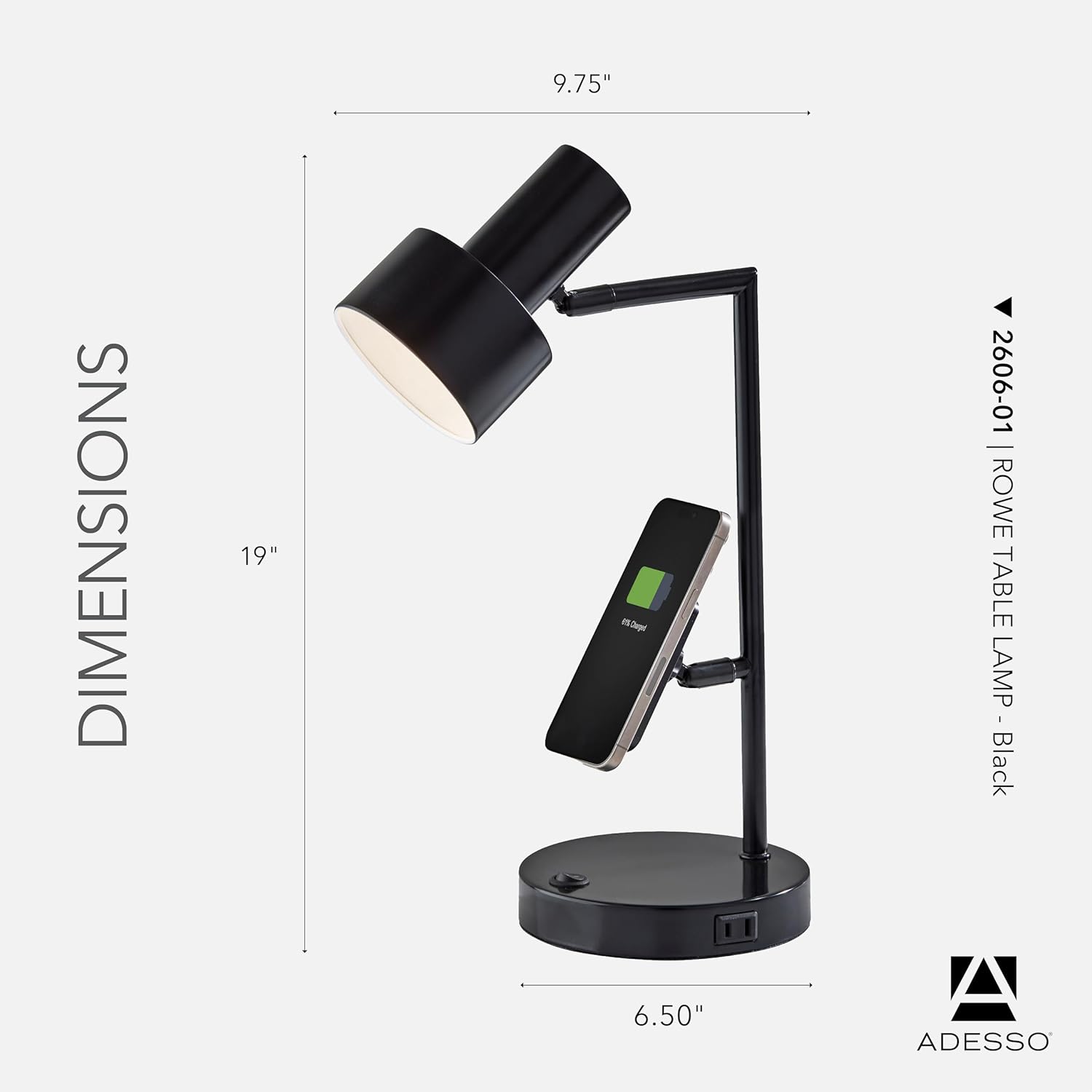 Upgrade your workspace or bedside setup with the Rowe Supercharger Table Lamp —a stylish, multifunctional lighting solution that keeps your devices powered and space illuminated. Finished in black and white interior, this lamp blends modern design with practical innovation, seamlessly fitting with any style home decor. Built for today’s tech-savvy lifestyle, it includes a USB-A port, USB-C port, AC outlet, and 10W Qi wireless charging pad on an adjustable magnetic base, letting you charge multiple devices at once—no extra cords or clutter required. The adjustable shade provides focused, comfortable lighting for reading, working, or relaxing. Whether you’re outfitting a home office, dorm room, or bedside table, the Rowe Supercharger Lamps come in three different colors to compliment different house decor. U.S. Patent No. 12,366,349 and other patents pending