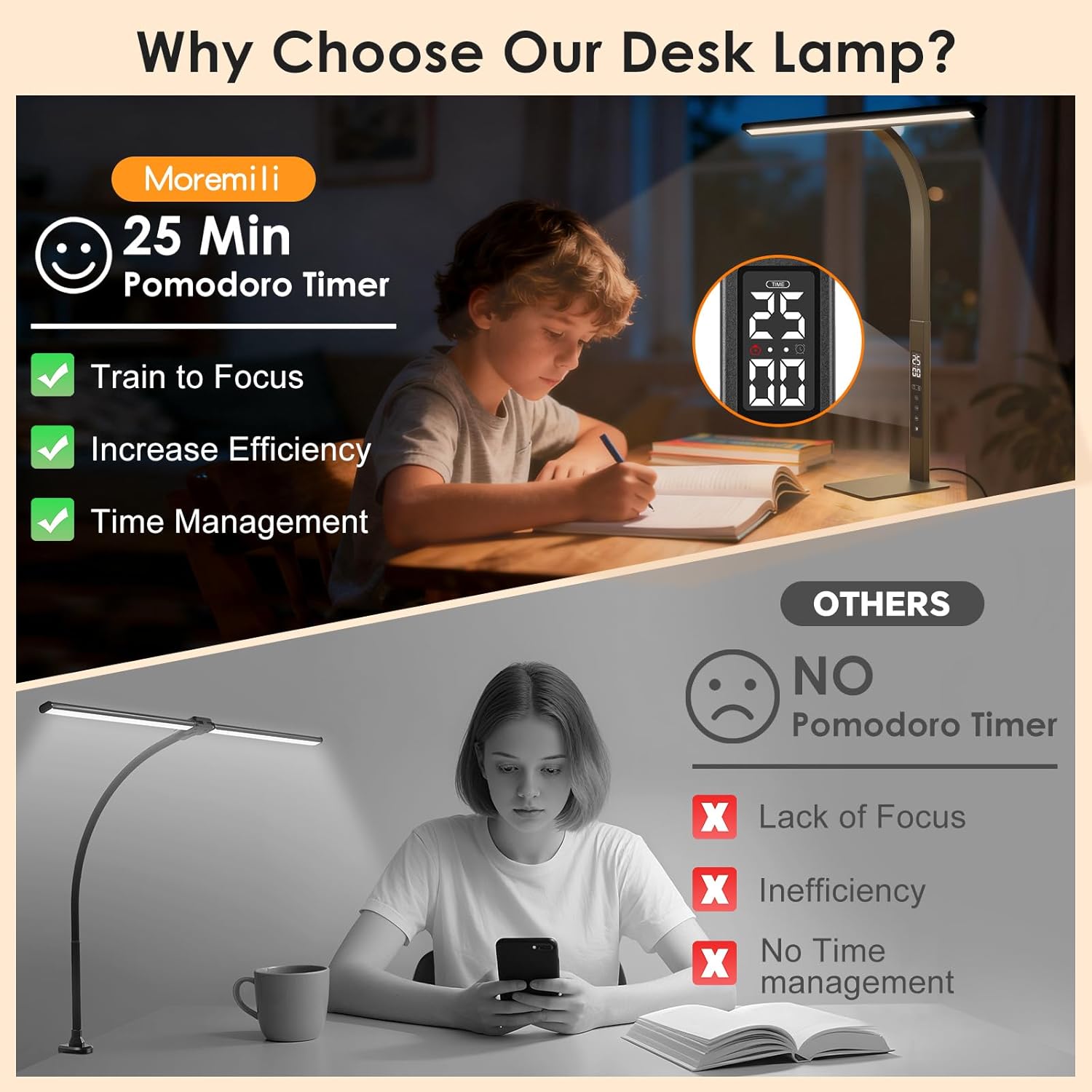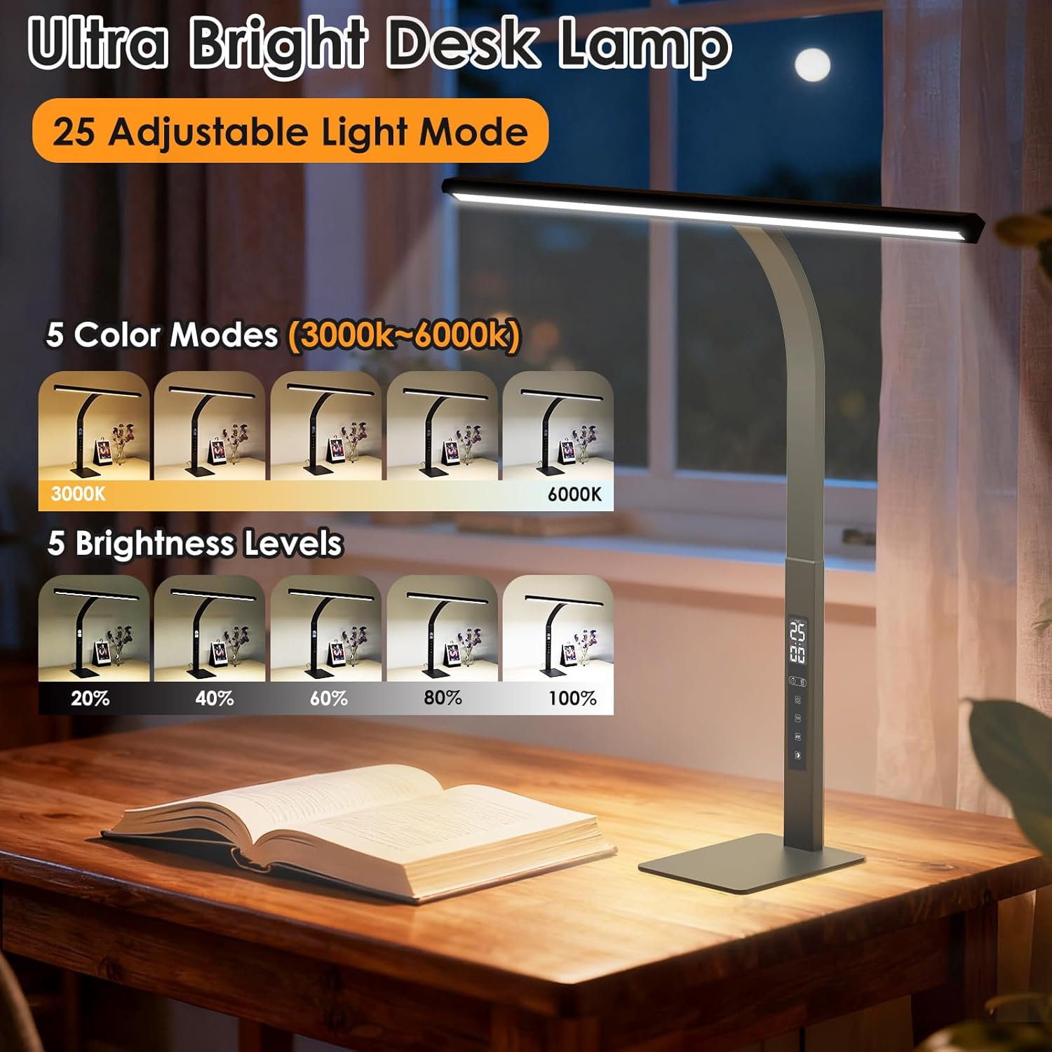 | Additional Features | 25-minute tomato timer function, Clock LCD display, Dimmable LED desk lamp, Full Adjustable, Touch Control |