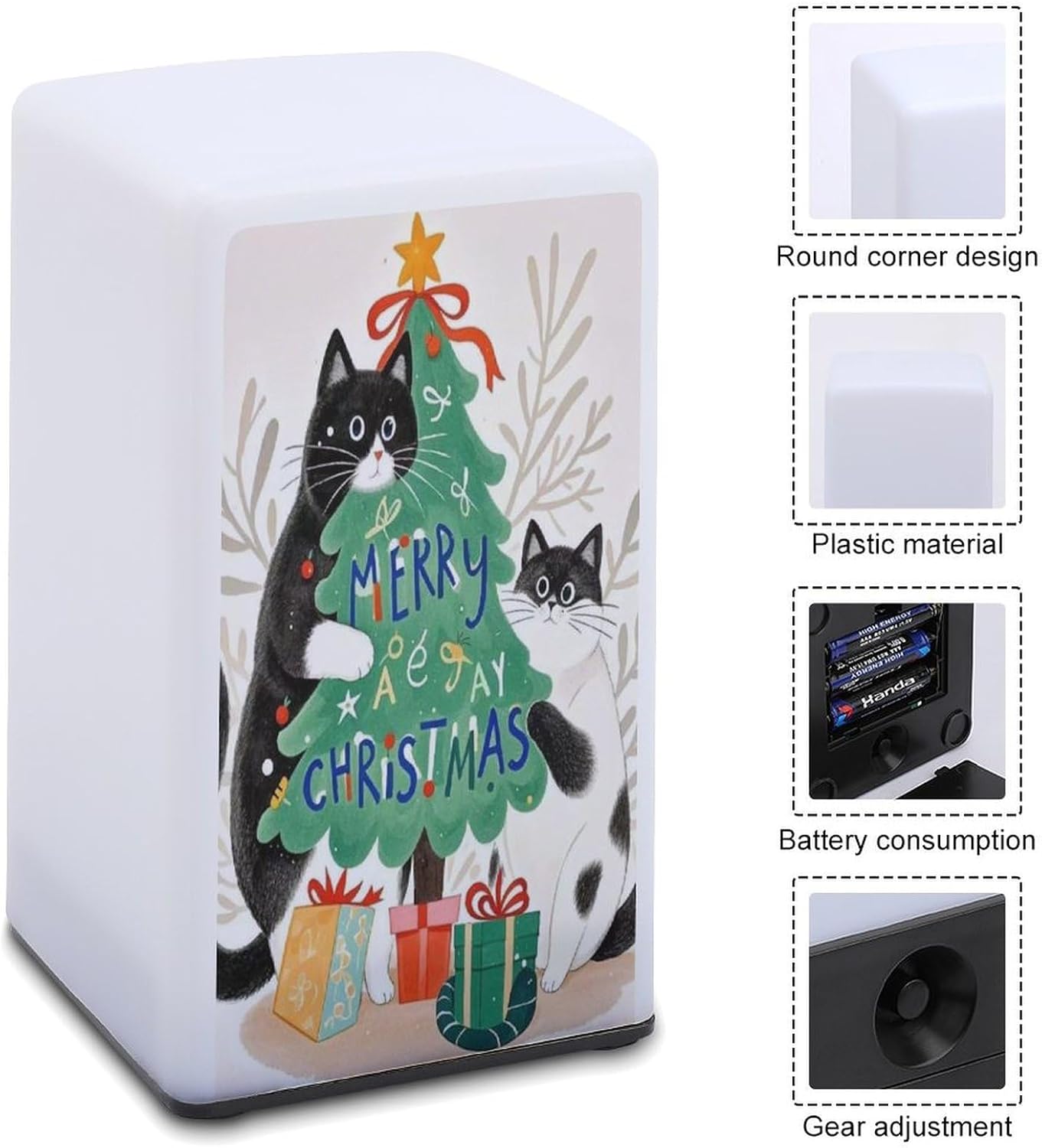 Tired of groping in the dark at night? Looking for a desk lamp that's both practical and stylish? Our Two Cats And Christmas Tree printed small desk lamp is the solution you've been looking for—designed to make everyday life easier and more personalizedSay goodbye to the same old, cookie-cutter desk lamps. We use UV printing technology to imprint your lamp with a design. Even years later, these designs remain visible, transforming an ordinary desk lamp into a treasured keepsakeThe soft, warm glow is a game-changer. For night owls, it means no more waking up your partner. For those afraid of the dark, it's a nighttime companion that dispels the darkness and helps them fall into a deep sleep. Even at the bar, it creates a warm and cozy atmosphere without being overly dazzlingIt's compact and portable, making it easy to place anywhere—by your bed, on a bathroom counter, or to take with friends. Its thick plastic material withstands accidental knocks and can be kept clean with a quick wipeStruggling to find a gift that's both practical and thoughtful? This lamp for dorm ticks all the boxes. It'll be a unique gift that shows you care. Your friends and parents will think of you every time they open it