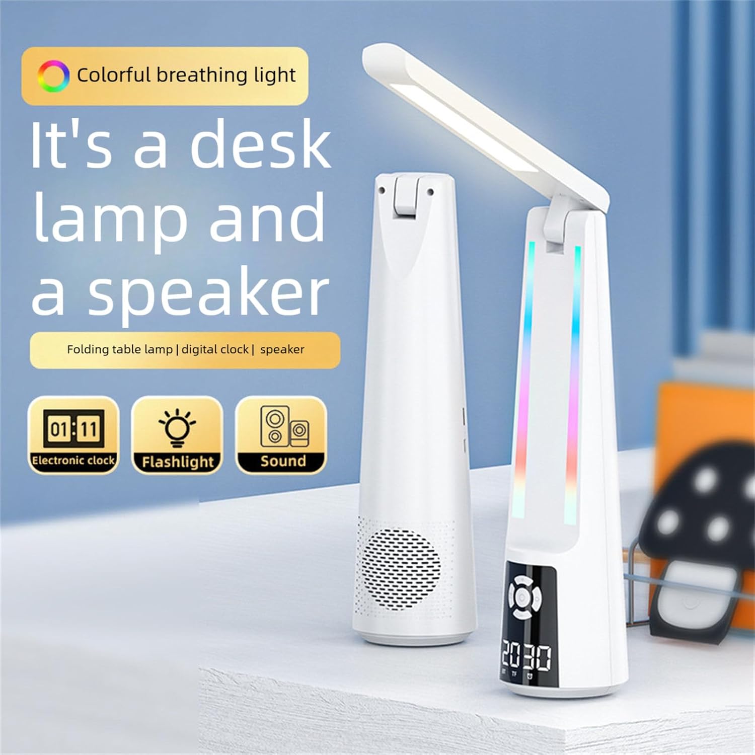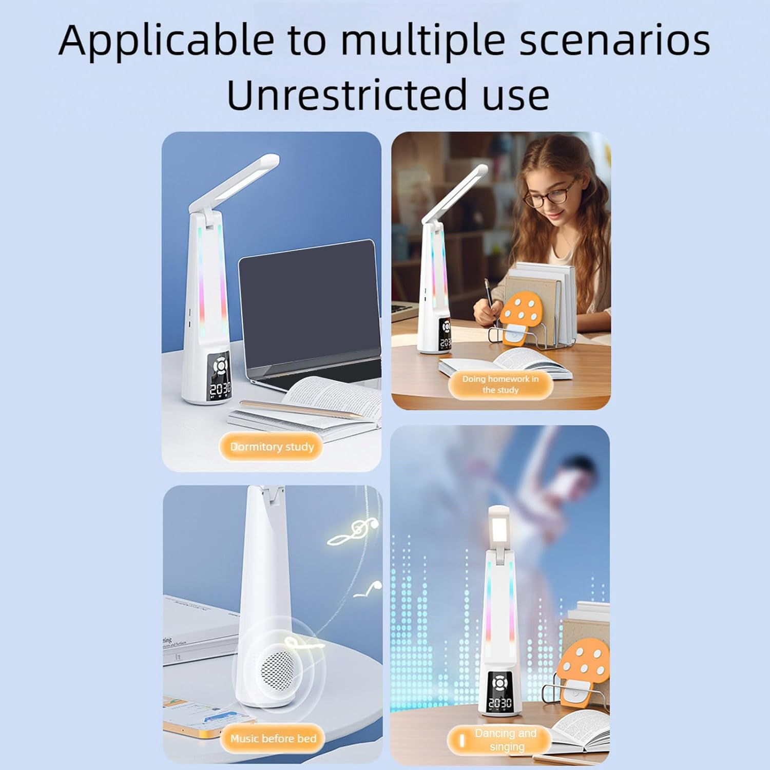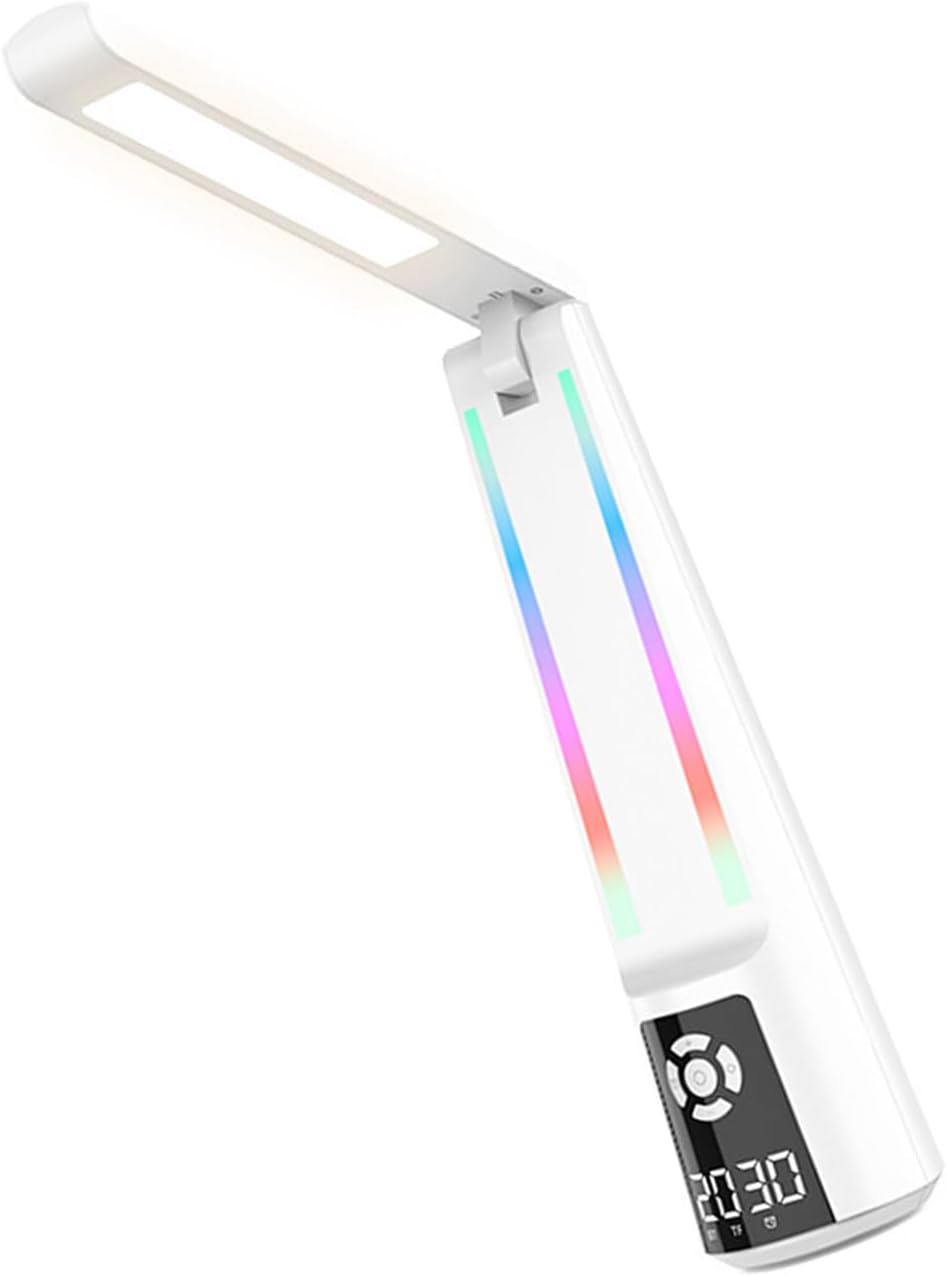 Folding LED Desk Lamp with Clock Alarm & Speakers Rechargeable LED Night Light Eye Protections Reading Light EnduringFeatures:This LED eye protections desk lamp features advanced optical design, providing soft and even lighting, reducing eye fatigue during long periods of study or work.The unique folding structure allows the desk lamp to easily adjust its angles to meet the lighting needs of different scenarios, such as reading, writing, or painting.Integrated digital display alarm clock function, for users to set time reminders and avoid missing important matters due to focus.Equipped with dazzling lighting effects and sound systems, providing a double enjoyment of visual and auditory senses.Suitable for students, office workers, and other people who need to use their eyes for a long time, helping it maintain efficiency at night.Specifications:Component: Packaging size: about 301x83x83mm/11.85x3.27x3.27inchPackage Includes:1pc Desk LampNote:Please allow 1-2cm errors due to manual measurement, make sure that you do not mind before you order. Due to the difference between different monitors, the picture may not reflect the actual color of the item.