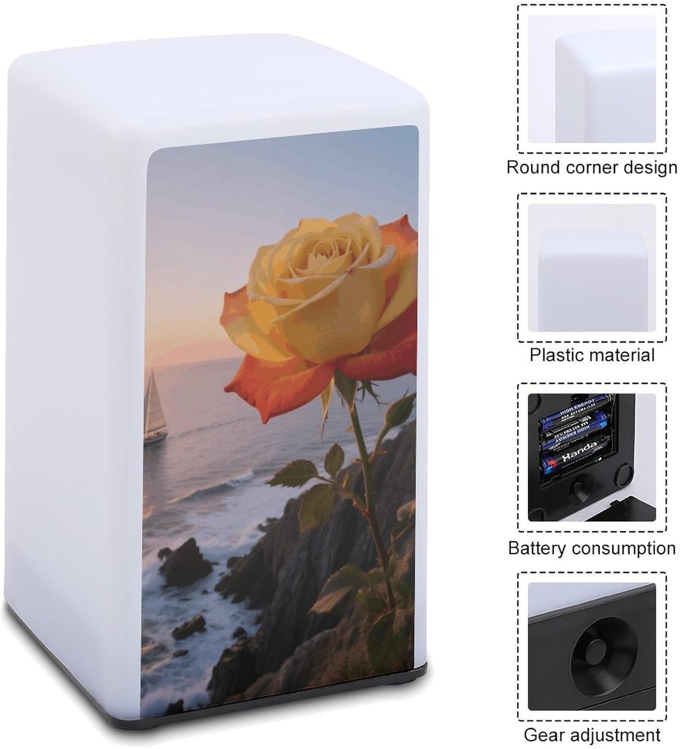 Our Roses by The Shore reading lamp offer the ideal blend of functionality and daily portability, adding sophistication and warmth to your homeCrafted from nice plastic, this night lamp for bedroom,is lightweight, durable, and easy to clean. It emits a soft, warm glow that can guide you through a dark hallway or help you use your phone in bed without disturbing your familyPowered by 3 AAA batteries (batteries not included), this cute end table night light,is suitable for bedrooms, kitchen, bathrooms, bars, and more. Its classic design complements most home styles and makes an ideal gift for family and friends
