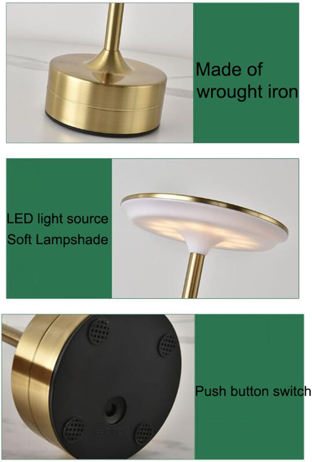 Product Name: Rechargeable LED Decorative Table LampMaterial: Wrought ironLight source: LED-2WBattery capacity: 1200mAhVoltage: ≤36VControls: Bottom button + top touchApplicable scenes: indoor spaces that can be installed, such as living rooms, bedrooms, corridors, corridors, study rooms, offices, etc