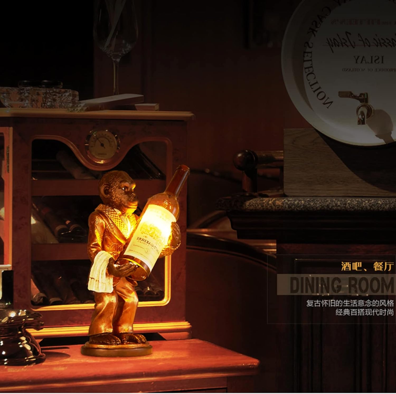 Name: Bedside Table Lamp / Indoor Desk LightsLamp body material: Resin + glass wine bottleStyle: loft retro industrial styleVoltage: 220VModeling: gentleman monkey holding a wine bottleProcess: Hand-carved, polished, baking paint, grinding, cutting, etcSize: 16cm*20cm*40cmColor: gold, redLight source type: E14*1(NO light bulbs)Use area: 5-8 square metersSuitable for living room, bedroom, study, bedside table, balcony, hotels, clothing store, coffee shop, apartment room of vintage style, etcpacking list1XLED desk lamp