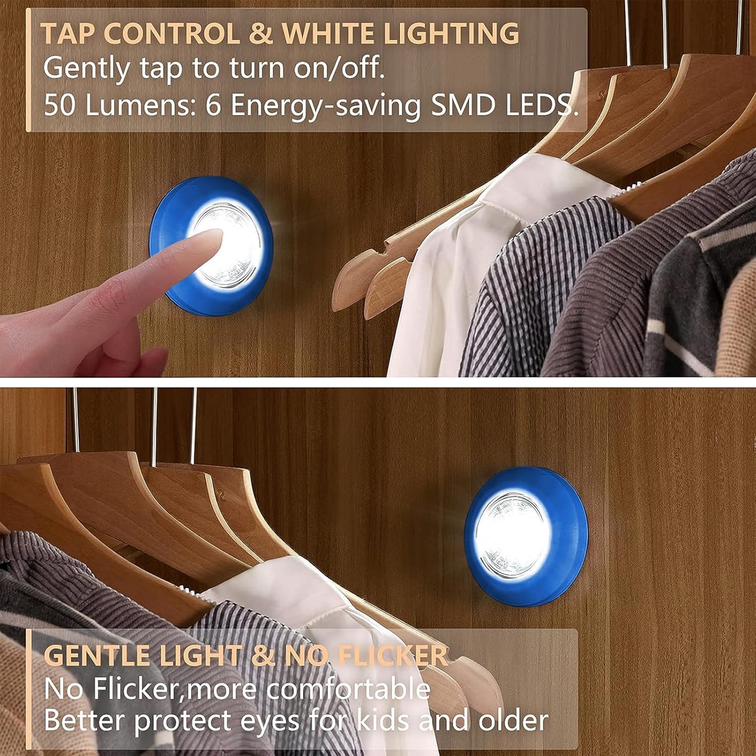 Cob Push Light is your small but faithful and reliable friend. After you have it, you will no longer have to suffer from darkness - For example, looking for something in kitchen cabinets in the dark. Now you can enjoy bright light anywhere! It's suitable for use in wardrobes, cabinets, bookshelves, garages and other places.Specifications: 1.Name: COB Push Light 2.Material: ABS 3.Light Source: COB Light 4.Battery: 3 AAA batteries(Not included) 5.Switch Mode: Push-Button 6.Brightness: 50 lumens, 2800k 7.Size: 2.95*2.95*0.91in 8.Weight: 0.07lb 9.Color:Blue Color BodyFeatures: 1.Equipped with new COB LED technology, the COB Push Light can output 50 lumen of intense light. 2.With self-adhesive sticker on the backside, it can be attached to any flat surface in a horizontal or vertical position.Simply stick it to your desired flat surface and it’s ready for use.3.Packing list: 5 Push Light;5 Double-sided adhesive pad,1 User Manual