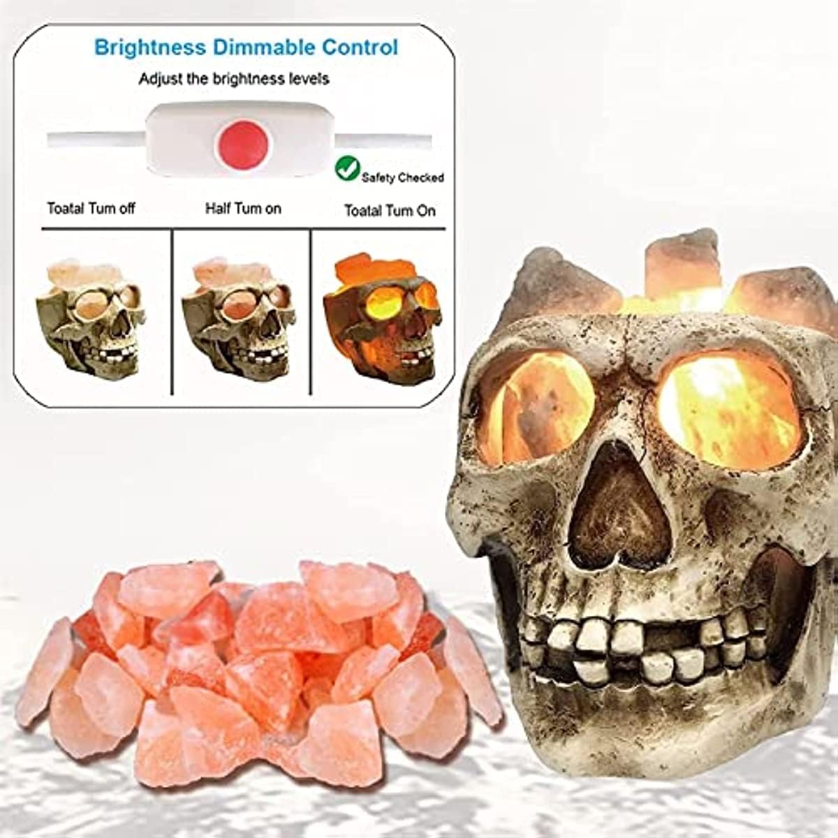 [CRYSTAL SALT LAMP] : Himalayan salt lamps emit negative ions, The bulb inside of the lamp heats the crystal and supports theionizing effect salt itself is hygroscopic and attracts the water froom the surroudings. Due to the gentle heat of the lamp, the water quickly evaporates and during the evaporates process the beneficial negative ions get created. The only place where you can acquire authentic Himalayan pink salt. [SPECIFICATIONS] : Material: 3D skull type + 100% Natural Himalayan Salt Rock Size: 14x12.5x11cm/5.5x4.9x4.3in Weight: 1.3kg/piece Craft: handmade Packing: foam + color box Power supply mode: USB cable power supply [PACKAGE INCLUDED] : 1*skull light 1*Packing box