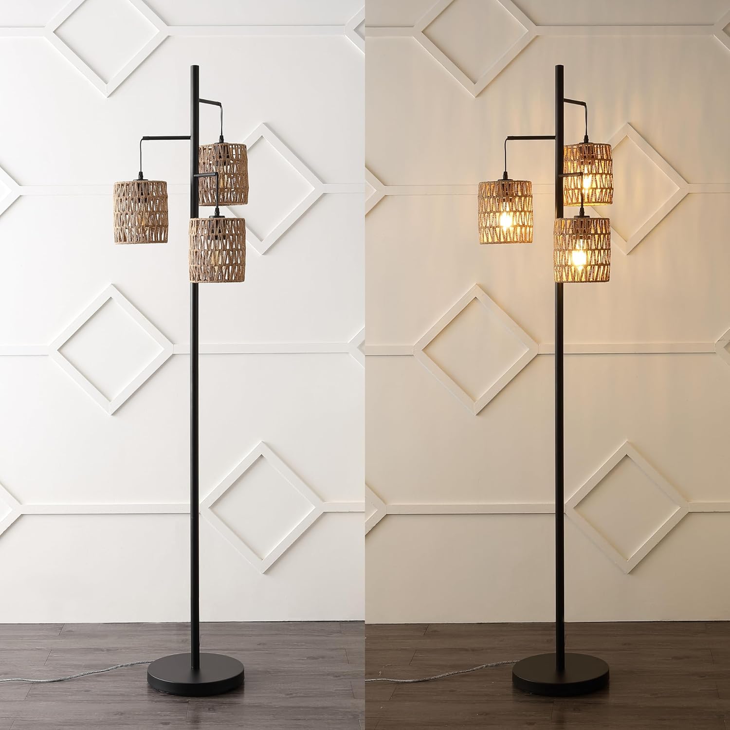 Vintage style meets Bohemian chic in our retro 3-light floor lamp. LED bulbs provide warm, bright light for reading. The diamond-patterned paper rope lampshades add a cozy ambiance to the living room or bedroom.