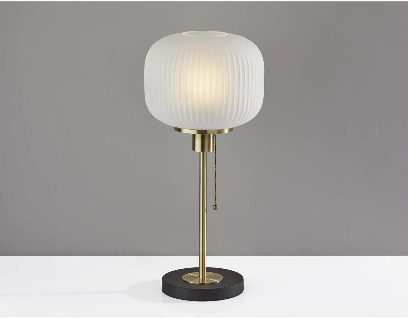 Add a classy touch of mid-century design to your space with the Hazel Table Lamp. A frosted ribbed glass shade emits a beautiful ambient glow when lit. Turn the lamp on and off with a convenient pull chain switch. An antique brass finish and a black base add to the clean, modern design. All Adesso lighting product is either UL or ETL listed, meaning that it has been tested and approved to meet the government-regulated safety standards for the USA.