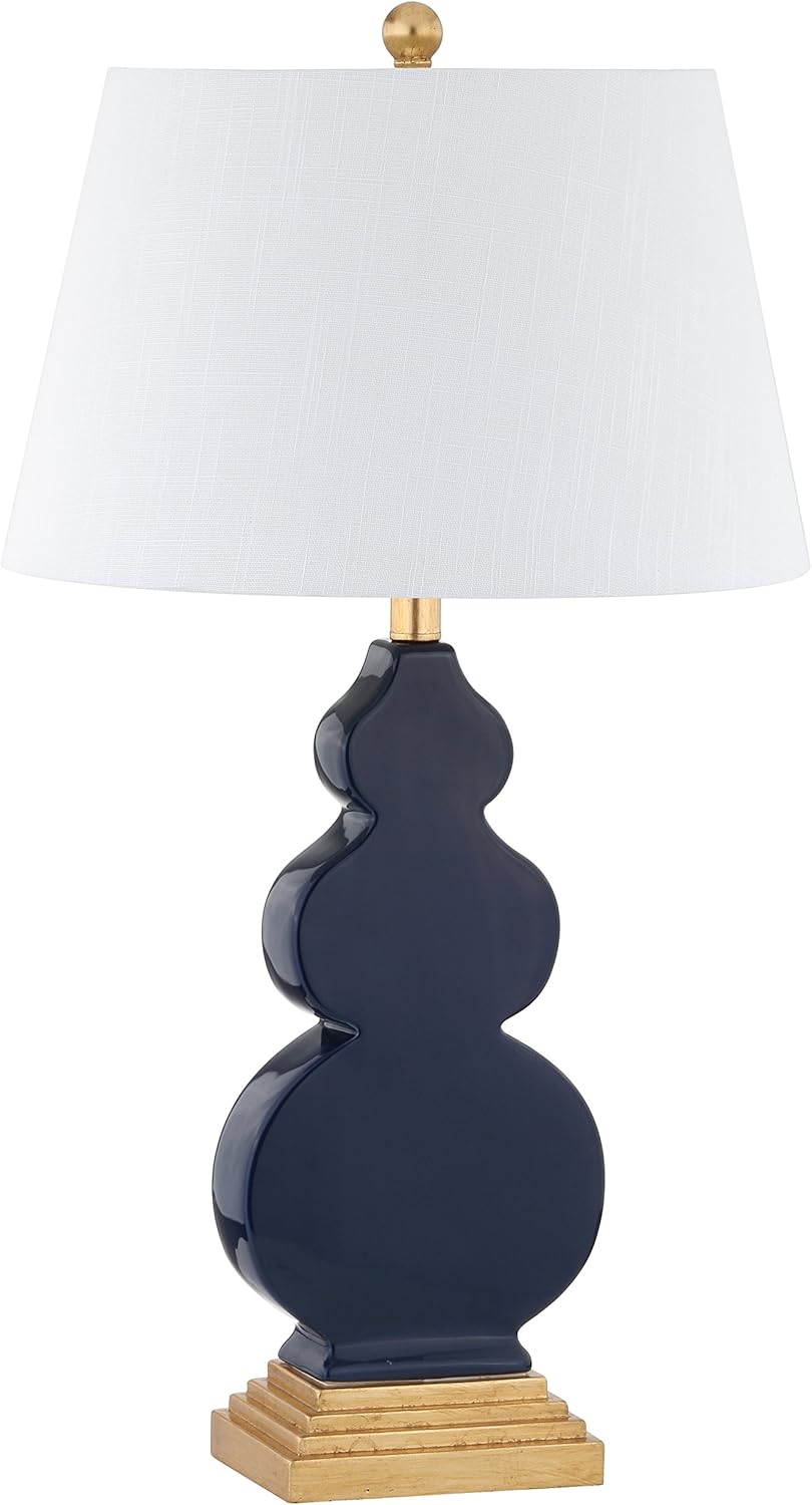This beautiful tapered triple gourd base ceramic table lamp will brighten up your home with the elegance of contemporary style. Modernized from the midcentury classic by a revised shape that is flat on two sides but retains the classic curves of the original, the look is completed by a gold leaf stepped pedestal base. Finished in a glossy navy blue glaze, it is topped with a slightly tapered cotton linen drum shade and gold finial.