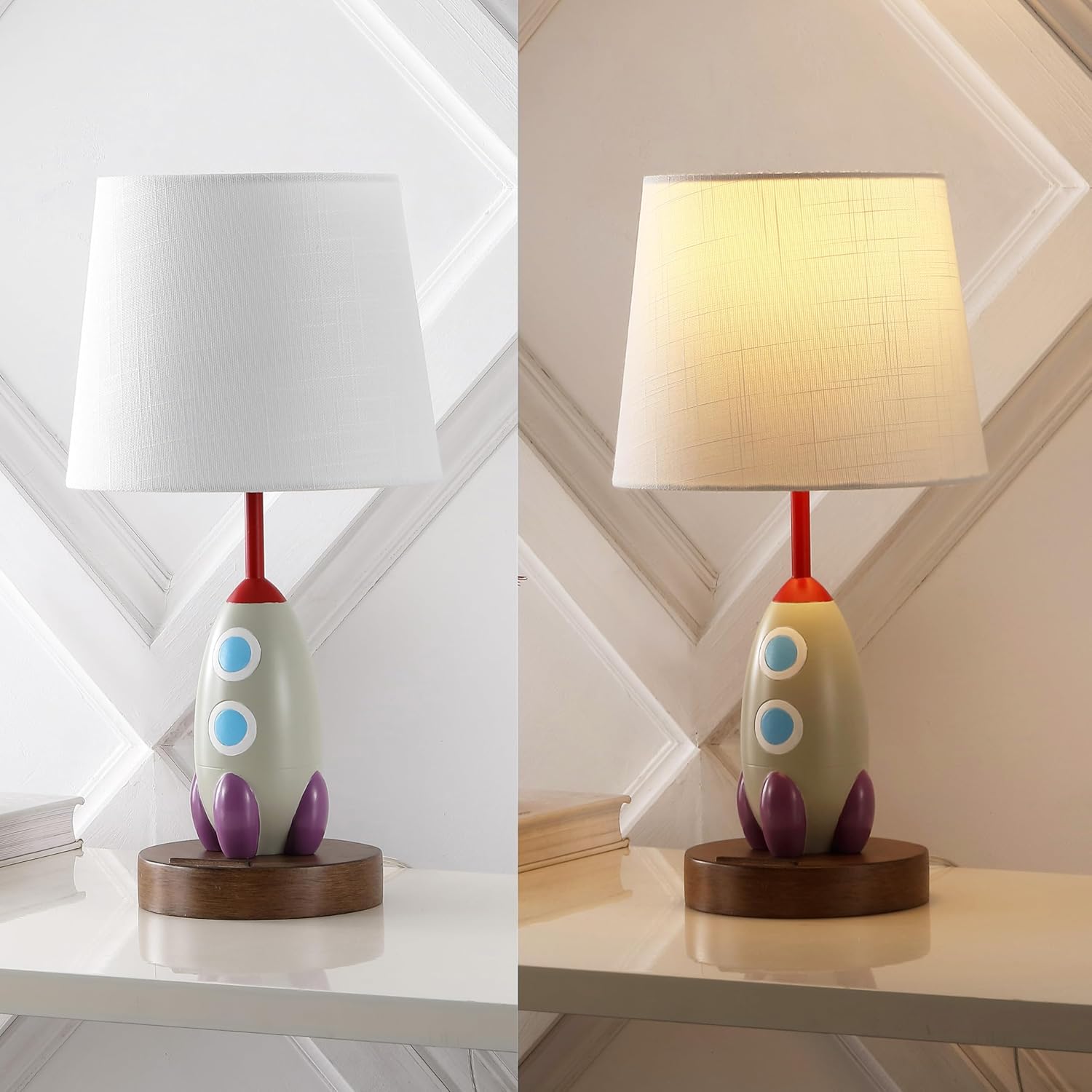 Your child's bedroom will immediately get a boost of mid-century fun with this rocket shaped table lamp. Made of a colorful painted resin base and soft linen shade, it's the perfect addition to any classic or vintage space. The curved rocket shape will delight and illuminate your space in style.