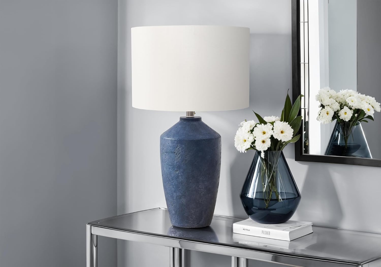 Transform your living space with Monarch Specialties' sophisticated 25-inch table lamp, featuring a striking blue concrete base with a rustic finish that adds character to any room. The contemporary design seamlessly pairs with a modern ivory fabric drum shade, creating the perfect balance between industrial charm and elegant aesthetics. This versatile lamp brightens any corner of your living room, bedroom, or office with its 3-way switch that lets you customize the ambiance using bulbs up to 100W. The lamp's thoughtful dimensions make it an ideal accent piece for nightstands, console tables, or side tables. Standing at 25 inches tall with a 15-inch shade diameter, this lamp commands attention while maintaining practical proportions. The 5-foot cord length offers flexible placement options, while the durable concrete and metal construction ensures lasting style. Each lamp includes a 2-year limited warranty, making it a reliable addition to your home decor collection. Whether you're reading, working, or setting the mood, this contemporary table lamp delivers both functionality and sophisticated style.