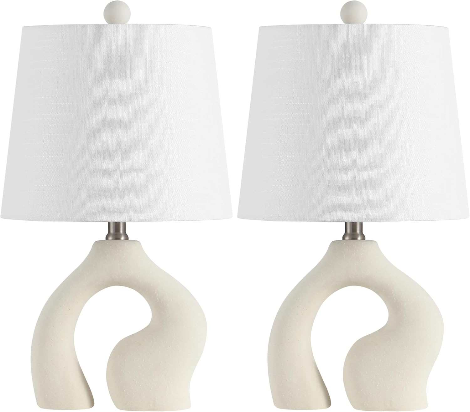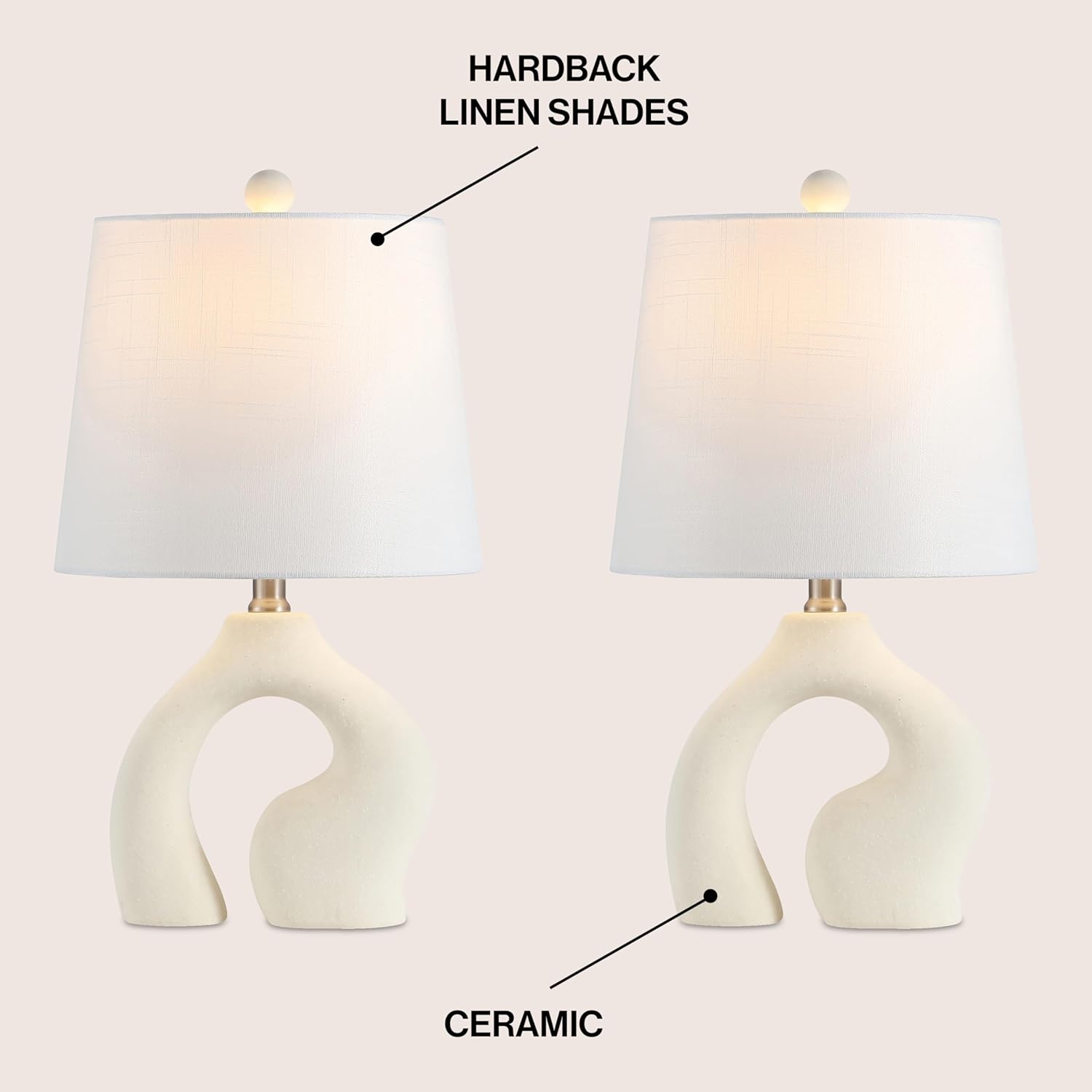 This modern pair of table lamps boldly embraces organic forms for a minimalist look. The ceramic base has an open arch with sinuous curves for a windswept look. Softened by a linen shade, a single LED bulb provides plenty of warm, bright light in the living room or office