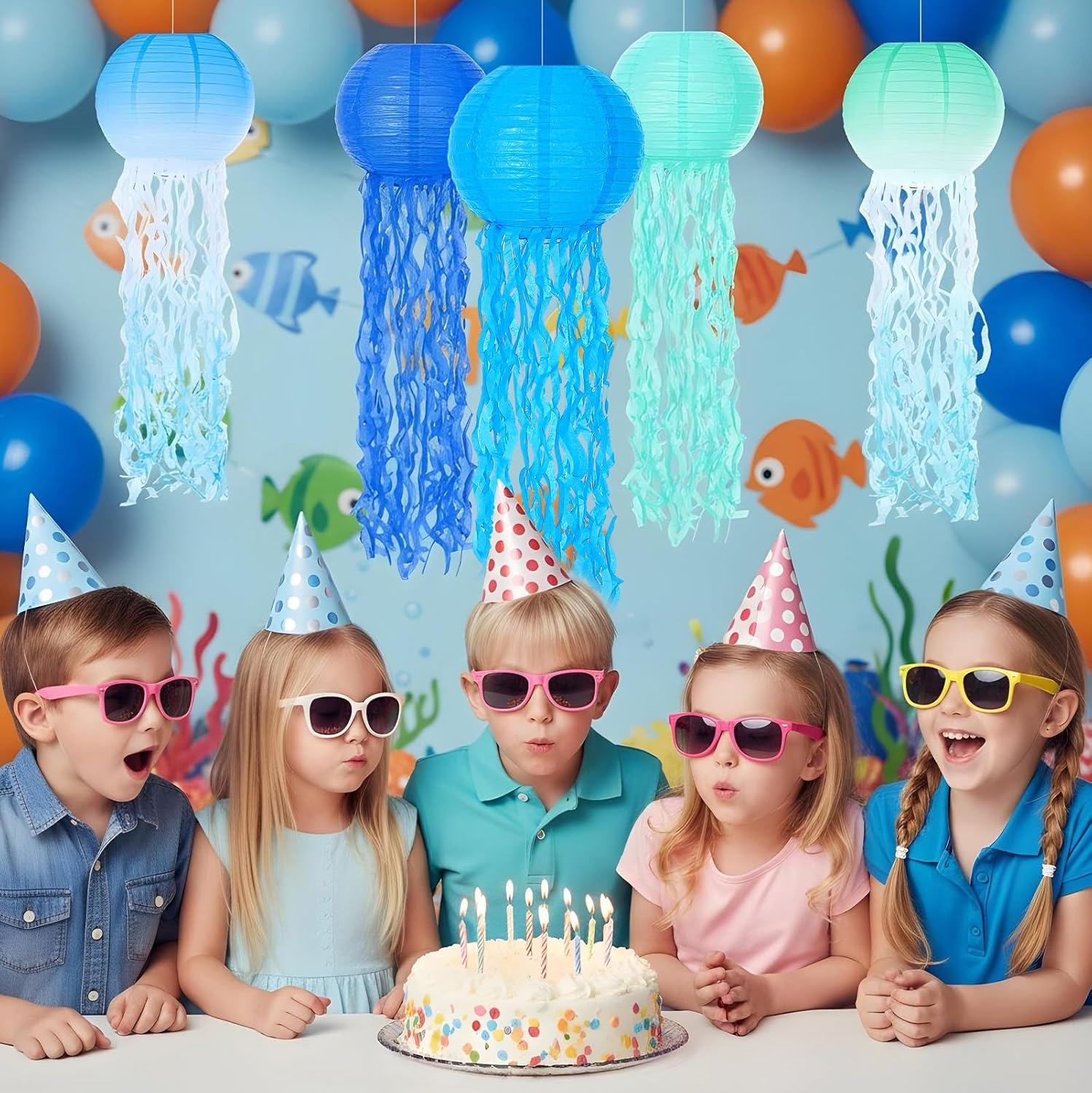 Create an enchanting underwater world with our 12-piece jellyfish paper lanterns hanging collection. These beautiful jellyfish lanterns feature six captivating colors and measure 10 inches with 23.6-inch flowing tassels. Perfect as jellyfish lantern hanging decoration for parties, these hanging jellyfish decorations transform any space. Our premium jellyfish decorations are crafted from durable materials, making these jelly fish decoration ideal for multiple uses. Enhance your jellyfish party decorations with this complete jellyfish hanging decor set that brings ocean magic to life.SpecificationMaterial: PaperColor: Blue, Sky Blue, Dark Blue, Light Blue, Gradient Blue, Gradient GreenSize: 10 inches/25 cm in diameter with 23.6inches/60 cm tasselsPackage includes:12 pcs jellyfish paper lanterns hangingNOTES:Due to manual measurement, there may be slight errors in size.The color may exist a slight difference due to different screen displays.If you have any questions about our products, please contact us. We will be happy to serve you.