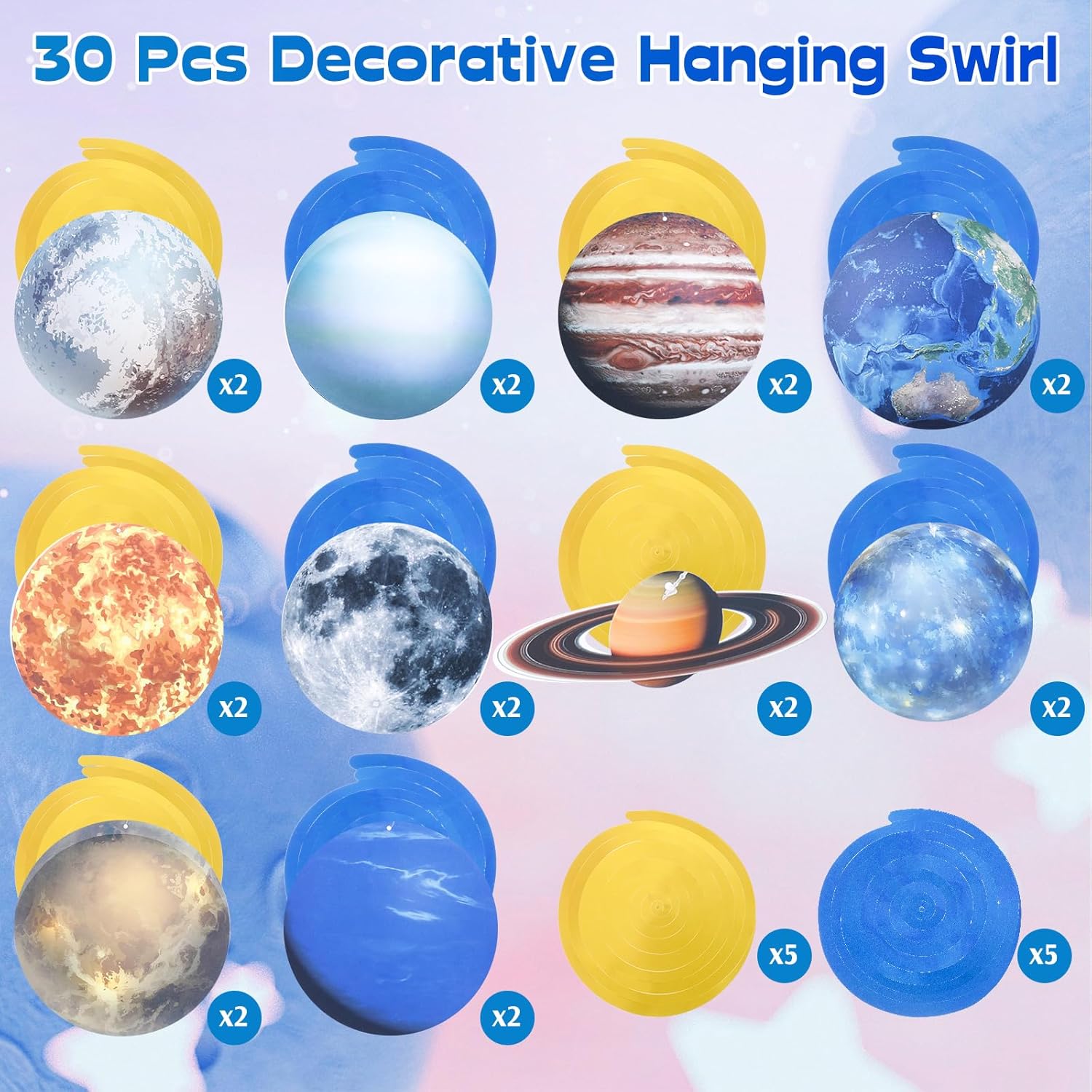 Features: Gift for space lovers: This set of planets decorations isn't just for parties. It also makes a lovely gift for space enthusiasts of most ages. Whether for a birthday, a graduation, or just a simple appreciation gift, these decorations can impress your gift recipients. Efficient space lanterns: Assemble the planets, paired with hanging swirls, and watch as your room transforms into a vibrant galaxy. Specifications: Main material: Planet lantern, hanging swirls: paper Color: as shown in the picture Size: Hanging swirls: about 6.3 inches/ 16 cm Paper lantern: about 12 Inches/ 30 cm Package includes: 30 x Space party planets hanging swirls 9 x Planets paper lanterns Notes: Manual measurement, please allow slight errors on size. The color may exist a slight difference due to different screen displays.