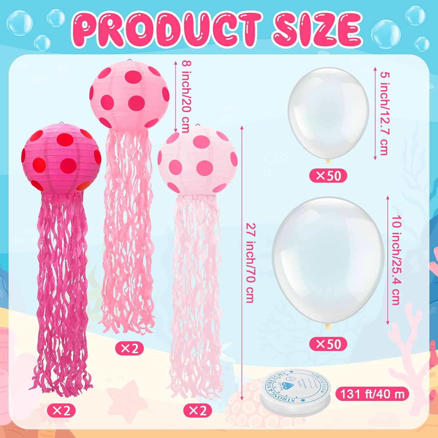 6 Set Sponge Party Birthday Decorations 8Inch Jellyfish Hanging Decor Jellyfish Paper Lanterns with 100 Clear Balloons Hooks String for Mermaid Ocean Sea Birthday Party Supplies Features: How to use: You can open the paper lanterns, then put the metal bracket into the lantern, snap it into the bottom opening, arrange the tentacles and finally stick round stickers on lanterns; please stay away the jellyfish party decorations from fire and water. Wide Usages: Our jelly fish decoration can be applied to jellyfish theme parties, mermaid birthday party, sponge parties, under the sea birthday party, sea turtle party, swim pool party, under the sea baby shower and ocean themed party. Specifications: Color: as pictures shown Material: paper Size: as pictures shown Package includes: 6 x Jellyfish Paper Lanterns Note: Manual measurement, please allow slight errors on size. The color may exist a slight difference due to different screen displays.